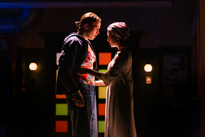It sounds intense, doesn't it, and it is. But Weinstein leavens it with abundant humor, stemming mostly from the contrasts between This World in Williamsburg and That One Out There. Schiff can pull a laugh out of sheer timing, though Tati isn't an overly ingratiating character. Yet neither is he a monster. Tati is thoughtful, loving, even witty–just ill equipped to deal with any phenomenon beyond his immediate existence, and that existence doesn't go beyond the Williamsburg Bridge. Director Tyne Rafaeli has some lovely ideas. Chief among them is having Dorfman voice the Chava puppets at various ages, often gesturing in concert with them, accentuating how disembodied Chava (Hebrew, incidentally, for "Eve") feels in a man's skin and garb. The pacing is perfect; it's just shy of two hours, and they fly by. Uranowitz is a fine Jonah, a harried young dad with conflicts of his own about traditional vs. progressive, and a special bow to Millan, who shows there's likely more to those Orthodox women you see on Bedford Avenue than they'll ever reveal–dutiful, yes, but with minds of their own. And another to lighting designer Ben Stanton, who can illuminate dozens of candles, and change the mood, at the flick of a switch. As Chava asserts her new identity and forges into territory unknown, we applaud her initiative and independence even as we mourn what she's leaving behind. Stein is now out of touch with her father and most of her dozen siblings, and a wrenching scene has Tati warning her that her son will be off limits to her, too. There are no easy answers here, no reconciling of the two divergent paths Chava must choose between. One theatregoer might exit Becoming Eve thinking that religion ruins everything, and another might think, no, it offers purpose, structure, a map to a higher calling. Both would be right. It's indicative of Stein's and Weinstein's skill and bountiful heart that, even as we curse Tati's intransigence, we know where he's coming from and sympathize with the agony he feels. He doesn't intrinsically hate trans people. They're just outside his experience. And for that, yes, blame the confines of tradition. Becoming Eve Through April 27, 2025 New York Theatre Workshop Abrons Arts Center, 466 Grand Street Tickets online and current performance schedule: NYTW.org