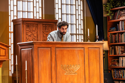 Billed as "a tragedy in five acts," and indeed it's tragic, it dramatizes the subtitle of Stein's book: "My Journey from Ultra-Orthodox Rabbi to Transgender Woman." Born and raised in Williamsburg's Hasidic community, Chava (Tommy Dorfman), the sixth child and first son of a distinguished rabbi, is raised to follow strictly in his footsteps. The family were direct descendants of the Baal Shem Tov, an 18th century mystic generally credited with the founding of Hasidism. Thus they were granted unchallenged status in the community, and given preassigned existences. Young Man (we never do find out Chava's given name), you are going to be a rabbi, and that's that. We meet Chava, in costume designer Enver Chakartash's short-short skirt, as she's rendezvousing with Jonah (Brandon Uranowitz), the progressive rabbi at a makeshift Upper West Side synagogue, well rendered by Arnulfo Maldonado's shabby-genteel set. She has nervously invited her parents to, essentially, come out to them, with Jonah's helping hand. But only her father, Tati (Richard Schiff), shows up. "Better for me to know what this is all about than to drag her all the way up here," he grumbles to, as he still sees Chava, his son. All are speaking in Yiddish, and we get that quickly. We'll meet Tati's wife, though, in delicately rendered flashbacks that go all the way back to when Chava was a two-and-a-half-year-old boy. How to portray him/her at so many phases of his/her life? With puppets, of course, beautifully realized by designer Amanda Villalobos and operated by Justin Otaki Perkins and Emma Wiseman. In the first flashback, Mami (Judy Kuhn, who, happily, gets to sing a bit, lullabies and hummed tunes) is comforting her young son, who hears that he's due to receive a haircut on his third birthday, and panics at the prospect: "I don't wanna cut my hair, I wanna be like my sisters!" (He's awfully well-spoken for a two-year-old, but let that go.) You'd expect that to be a harbinger of conflicts to come, but with this Orthodox bunch, sexual confusion just doesn't register.