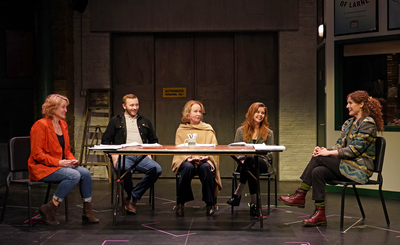 The title refers to the Irishtown Players, a venerable Dublin troupe. They recently had a major success, The Happy Leper of Larne, and they're huddled, on Colm McNally's utilitarian set, around the first table reading of the newest play by Happy Leper's author, Aisling (Brenda Meaney). We also see posters for past productions of The Weir, Dancing at Lughnasa, and other familiar titles; how different are Irishtown and Irish Rep, at that? A lot of exposition is rolled out right away, and admittedly, it's something of a chore to sit through, though without it the payoffs wouldn't pay off as much. Aisling is bubbling over: Her new play, Who Are We If We Are Not Ourselves at All, is already headed for Broadway in a few weeks, with this cast and director. Which seems a bit of a stretch, but roll with it. The cast: Síofra (Saoirse-Monica Jackson), a rising Irish ingenue and Aisling's lover; Constance (Kate Burton), a veteran who's worked fairly steadily but never risen as far as she expected; and Quin (Kevin Oliver Lynch), an alpha male asserting his masculinity in uncomfortable, if not ill-intentioned, ways. He deems himself a master of accents, though those accents turn out to be South Dublin, North Dublin, and Derry–which he tries on for a while, hilariously and unintelligibly. The director is Poppy (Angela Reed), the only Brit among them, recently dismissed from the Royal Shakespeare Company for unsavory reasons we'll soon discover. So, the usual enthusiastic words following a first read: Who Are We is "propulsive," it's "great," "seminal." But that's within the playwright's earshot. Aisling retires to the theater office to field a phone call from the American producer, and the daggers come out. Why did she set this one in Hertfordshire? Why is the play, about sexual assault at work, so laden with legal jargon? And why isn't it, you know, more Irish? As Quin puts it, "Where's the lyricism? Where's the backward syntax?" Or Constance: "Where are the rolling hills, where is the bar, why is everyone alive?" And we're plunged into a rollicking Hibernian backstager, with the personal and professional conflicts piling up to the point where Aisling pulls her play, to the cast's and director's horror. They have a contract, they have to bring something into New York. So, Quin suggests, why don't they slap the Who Are We title on an improvised Irish play? "I've been in a million Irish plays, I can pump the audience so full of Ireland they'll have shamrocks coming out their noses." And that sets the stage for the quartet's efforts to cobble together an Irish play out of all the standard elements, Smyth's real satirical target. Incest? Gotta have. Alcohol? A must. Potato famine? Why not. As the actors spout out improvised soliloquies and dialogues, we're treated to some jovial parodies of the Irish canon. There's a fine sendup of Enda Walsh's The Walworth Farce and Beckett's Play, complete with Quin in an urn. A little O'Casey, a little O'Neill, a dash of Friel–all with the backward syntax Quin so craves, and the heightened lyricism that becomes, in this context, quite funny. The troupe tries several premises, but all roads lead back to sexual assault, such is the Irish play. In the process, we get to know these actors better. Síofra, while ambitious and self-centered, comes up with unusual psychological insights, always punctuated with, "or something." Quin can't help asserting his male prerogative. Constance, with decades of experience and not enough to show for it, has anger issues (Burton might want to dial down on the anger). And Poppy, always attempting to be the peacemaker, finally explodes, because, well, these effing Irish. There are minor character contradictions and plot implausibilities (why would Aisling insist on a British setting, and her late-revealed past history with Quin doesn't add up), and a last-minute deus ex machina that's hard to buy, but you'll probably be having too good a time to strongly object. A lot of the credit goes to the actors, with Jackson exuding up-and-coming-actor calculation, Meaney a writer's fragile ego, Reed a director's well-worn and eroding coping mechanisms, and Lynch the awkwardness of being the only male in the room. Caroline Eng's sound design is blissfully natural, not a face mic in sight, and punctuated by some energetic drum riffs between scenes. Orla Long's always-appropriate costumes were more work than you first realize, with the cast changing outfits at every interval. And Nicola Murphy Dubey's direction keeps the emotions high and maximizes the movement, a challenge when you're staging a table read. Irishtown, while it does have something on its mind–the sameness of themes in Irish drama, and audiences' unwillingness to accept anything beyond them–is inconsequential, and it takes a while to get started. But it did make me laugh out loud several times, something relatively few Irish plays across the years have ever managed to do. On purpose, at least. Irishtown Through May 25, 2025 Irish Repertory Theatre Francis J. Greenburger Mainstage,132 West 22nd Street Tickets online and current performance schedule: IrishRep.org