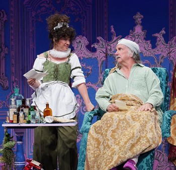 As did Molière, Hatcher spoofs hypochondria, class consciousness, legal subterfuge, and greedy medical professionals. It's a simple story: Argan (Mark Linn-Baker) mistakenly fancies himself to be deathly ill. Toinette (Sarah Stiles), his maid, is skeptical, and rolls her eyes at frequent intervals as he complains of his many maladies. She also challenges him head-on at every turn in a confrontational manner that must have shocked 17th century audiences–servants just don't do that! Béline (Emily Swallow), Argan's new wife, attends to him solicitously and professes great sympathy; in fact, she's after his fortune and has teamed up with De Bonnoi (Manuel Felciano), her lawyer and main squeeze, to rob him of it. Meanwhile, Angelique (Emilie Kouatchou), Argan's sweet daughter from his first marriage, has fallen in love with the equally sweet but quite stupid Cléante (John Yi). Bad timing, as Argan has just affianced her to Thomas (Russell Daniels), the brainless son of Dr. Diafoirus (Arnie Burton), one of his three doctors; the other two will also emerge, and all are played by Burton. So expect lots of quick changes from him, including, thanks to Tilly Grimes's clever costume design, a moment when he plays all three at once.
