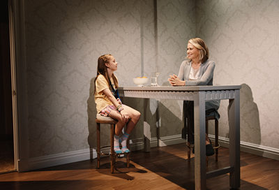 The play follows a bruised mother-daughter road trip from West Virginia to Illinois, as Maddie (Chloë Grace Moretz) tries to protect her nine-year-old trans daughter Caroline (River Lipe-Smith) after an abusive episode with Maddie's partner Brian. With nowhere else to turn, she seeks refuge with her own mother, Rhea (Amy Landecker), after many years of estrangement. The uneasy reunion forces prolonged confrontations. Maddie, perpetually in recovery from substance abuse, carries a lifetime of guilt, while wine-sipping, suburban Rhea routinely deflects responsibility. Young, confident Caroline, caught between them, insists on truth, kindness, and authenticity. While the plot veers away from formulaic narratives and predictable contemporary conflicts, the play captures a neverending cycle of accusation and avoidance that may feel familiar to anyone who has witnessed families suffering through addiction and estrangement. Caroline's identity as a trans girl resonates with her mother Maddie's struggle to stay sober as they both fight to prove themselves in the face of institutions that deny their reality. In a devastating bit of dialogue, Caroline worries she will "never be a girl" because a classmate claimed scientists could someday identify her skeleton as male. Yet Caroline is powerfully self-assured, choosing her own name–immediately affirmed aloud by Maddie in the diner scene and later beaded onto a bracelet in their hotel room. Through Maddie and Caroline, the play poses powerful questions including: How do you assert who you are when the world insists otherwise? What does forgiveness look like when everyone has made mistakes, and when children inherit the costs?
