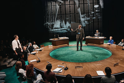 Part political thriller, part primer on gamesmanship, part expedition into the ins and outs of back-room (sometimes backstabbing) negotiations, Kyoto, written by the team of Joe Murphy and Joe Robertson, comes to New York via an Olivier-nominated London production. Its raised circular set (designed by Miriam Buether) not only juts out into the audience, but literally pulls some theatregoers directly into the goings-on by seating them around a conference table among characters who are in attendance at a series of United Nations-sponsored meetings at various locations around the globe. If you are seated there, you may be enlisted to participate in some small ways. As you get ready to enter the theater, you will be handed a lanyard and tag identifying you as a delegate to the Intergovernmental Panel on Climate Change. For instance, I was a designated representative of the Alliance of Small Island States, or AOSIS, one of many subgroups and acronyms that are created in a flash as necessity dictates, necessity being the mother of power-grabbing moments throughout the production. Like riding on a zipline, Kyoto, directed at its breakneck pace by Stephen Daldry and Justin Martin, whips us along a ten-year journey around the globe as various groups meet to cobble together a universally acceptable document that amounts to a commitment to combating climate change though the promissory note of "targets and timetables." That is a sore point that the wealthy global leaders (including the United States) find difficult to stomach, and it becomes a major bone of contention triggering walk-outs and threats of walk-outs. At times, it seems everyone is mired in quicksand, in which varying voices argue endlessly over every word and punctuation mark. There is one breathtaking scene in which the delegates, working late into the night, are bereft of interpreters. It is then that the Tower of Babel analogy comes into full blossom before our eyes. Funny in a Samuel Beckett absurdist sort of way, until we consider what is at stake here. Throughout, it seems few if any of the participants are actually motivated by a desire to curb climate change. The universal goal seems to be to meet the interests of those in power in their respective countries. The American perspective is largely represented by the chain-smoking oil industry lobbyist Don Pearlman (a genial Stephen Kunken), who is enlisted to trip up the proceedings and who damn near manages to do so at the final gathering of delegates in Kyoto, Japan. That is where, in a marathon session, the first international treaty was being cobbled together as a commitment to collective action (those infamous targets and timetables). By necessity, there is a lot of information we are asked to absorb here, and it is a real credit to all involved in this production that none of this comes across as pedantic lecturing. Helpful video projections and conversational interactions among the cast members make all of this feel part and parcel of the play. The performances and rapid-fire timing throughout are rock solid, a thrill ride from start to end. In addition to Kunken, standouts are Jorge Bosch as the determined chair of the Kyoto summit, and Natalie Gold as Don's wife Shirley, supportive of him if not his cause. It's sobering to note what all has transpired since the events being portrayed here (the Kyoto Protocol was signed in 1997). The climate-change deniers have not gone away, and the ice glaciers continue to melt at an alarming rate. Kyoto summons up one brief shining moment of unanimity. Let us hope for a sequel, both in theatrical terms and in real life. Kyoto Through November 30, 2025 Lincoln Center Theater Mitzi E. Newhouse Theater, 150 West 65th Street Tickets online and current performance schedule: LCT.org
