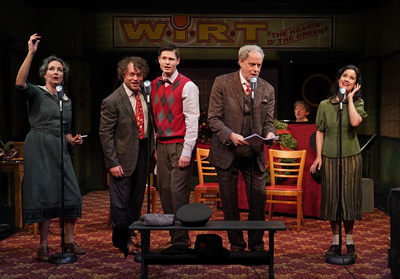 So you'll understand if I get a bit guarded about any attempt to mine riches from the original, which, incidentally, is #21 on the IMDB's top-250 movie list. There have been several: A terrible 1970s TV-movie starred Marlo Thomas as a distaff George Bailey; Sheldon Harnick and Joe Raposo wrote a stage musical adaptation in the 1980s that got some things right but still didn't match the source; another, by Keith Ferguson and Bruce Greer, gets produced with some frequency. And in recent years something called It's a Wonderful Life! A Live Radio Play, by Anthony E. Palermo, has been dotting the hinterlands, now landing at Irish Repertory Theatre, though what exactly is Irish about this property isn't clear. You can see what's appealing about reducing Bedford Falls, New York to five actors in front of big 1940s microphones: It's easy to produce, it doesn't need much of a set (though Irish Rep's, by James Morgan after a Charlie Corcoran original, is quite cozy and agreeable), and it taps into the memories of practically the whole audience, who know the story from endless seasonal TV showings when the movie went into public domain decades ago. But what can a purported December 1946 radio broadcast offer that It's a Wonderful Life can't? Well, variations on the original, ways of boiling it down to its essentials, and a heavy dollop of nostalgia. The movie runs about two hours ten; this version is an hour shorter. And by adding traditional seasonal songs (David Hancock Turner is the able music director), the Frances Hackett-Albert Goodrich screenplay is further diluted. This Bedford Falls, then, is considerably less populous. No Violet! No Annie, the Baileys' sarcastic maid! No Eustace, the furrowed-brow bank clerk! Only glimpses of the four Bailey children. So the actors, frequently switching roles, though Reed Lancaster is consistently George Bailey and Ali Ewoldt is Mary (she also juggles several amusing sound effects), have to establish their characterizations mighty quickly. Under Charlotte Moore's direction, they do pretty well. Ashley Robinson, covering everyone from Clarence the angel-second-class to Sam Wainwright to Uncle Billy, finds distinctive personalities in each. Rufus Collins's versatile voice varies to impersonate Mr. Potter, Gower the druggist, the radio announcer, and seven or eight others; his Potter hasn't the delicious out-and-out villainy of Lionel Barrymore, but he's satisfyingly hateful. And Leenya Rideout has a real workout, essaying Mrs. Bailey, Tillie, and many other characters, several of them male. Plus, this quintet has to run through a couple of 1946 radio commercials, promoting war bonds (was anyone selling war bonds in December 1946?) and the health benefits of smoking Lucky Strikes. Plus they all sing. Let's say they're a busy bunch. Lancaster's George goes in for a wide Midwestern drawl, catching many Jimmy Stewart vocal mannerisms, but you know he's not going to equal the pathos Stewart brought to George's breakdown and joyous recovery; how could he, bereft of Capra's close-ups, Dimitri Tiomkin's scoring, and so many missing lines? Ewoldt has Mary's devotion to family and attractive ordinariness down pat, and she can really sing. But her Mary doesn't grow as a character the way Donna Reed did; again, it's probably the shorthand adaptation's fault more than it is hers. The songs, pleasant listening in themselves, don't do a lot to enrich the mood–mostly, they're signposts. "Brother, Can You Spare a Dime?," complete with verse, tells us we're in the Depression and a run on the Bailey Building & Loan is imminent; the end of World War II is marked with "Keep the Home Fires Burning," which in fact was a World War I anthem. And Mary, telling George she's pregnant, would probably be very happy, but I doubt she'd launch into "Blue Skies." David Toser's costumes include some hilariously awful 1940s neckties, and I salute whoever got the bell on that large downstage Christmas tree to ring when, spoiler, Clarence gets his wings–how did they do that? And all right, when Clarence told George "each man's life touches so many other lives" and Harry Bailey toasted "my brother George, the richest man in town," I got misty–because the basic material's so good, and because the solid, democratic, multiethnic 1940s American values that saturate Bedford Falls are so different from where we are today. It's a Wonderful Life! A Live Radio Play (the original, by the way, lacks an exclamation point) is a sweet little evening, then, a nostalgic animated Christmas card. And if you haven't seen the movie lately, it's a quick reminder of what a thorough, life-affirming universe Capra created. When the camera pans across that crowded Bailey living room in the final scene and we see most of the population of Bedford Falls, we know at least a little something about practically everyone in the frame. (What other movie accomplishes that?) But get this: On December 14, the magnificent United Palace in Washington Heights is showing It's a Wonderful Life, complete with pre-movie caroling, theater organ accompaniment, and TCM's Alicia Malone interviewing Donna Reed's daughter. Now, that's worth a trip uptown. It's a Wonderful Life! A Live Radio Play Through December 31, 2025 Irish Repertory Theatre Francis J. Greenburger Mainstage,132 West 22nd Street Tickets online and current performance schedule: IrishRep.org