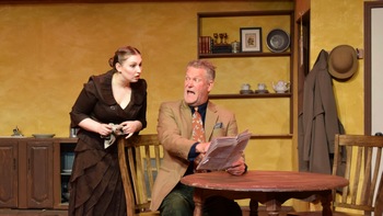 The Adobe Theater does farce well. Their small theater with its box-like setting is perfect for swift entrances and exits. The proximity of the audience makes it possible to read every actor's facial expressions. This clever play prompts sly, knowing glances, smirks, and broad laughter with its somewhat ribald action. To say that The Adobe Theater does farce well is no small compliment. Finding actors with the ability to zing a punch line and play over-the-top while maintaining a semblance of human realism is difficult. Near novice director Tanner Sroufe has found five accomplished and experienced actors to bring The Underpants delightfully to life. At the center of the action is a young couple, Theo and Louise Maske, who live a very predictable life in Dusseldorf. Theo is an exemplary civil servant and Louise a dutiful housewife until an incident at a parade for the King jolts their lives into chaos. Louise's panties fall down at the parade as the King passes by. This is an embarrassing, prurient action that signals a series of bawdy interactions with several peculiar gentlemen who come to rent a room from the Theo and Louise. Louise's underpants are the talk of the town and make her a near celebrity. Suddenly, Louise is a sex symbol! Louise's upstairs neighbor, Gertrude, fans the flames of sexual desire and suggests that Louise should take a lover, since Theo is not "performing his husbandly duties." She suggests that jealousy will light a fire in Theo so they can start the family Louise wants. Men always want what other men find titillating, or so the adage goes. The action of the first act flashes by as the wild poet and the sickly barber vie for Louise's hand in a series of loony, suggestive and wacky scenes. Brent Whitted is nearly perfect as Theo, the husband with hidden desires. His ability to switch from anxious bureaucrat to lustful companion is uncanny. Myles Hughes as Frank Versati, the poet and dreamer, is a delightful buffoon of a romantic lover. Drew Groves as the sickly barber is totally loony and perfect with one-liners. Kelly Hughes brings her own risqué physical observations to the mix. Through it all, Sarah Kesselring's Louise remains befuddled and yet lustful. This is truly a sex comedy laugh riot. They say that no authors have a second act in them anymore. Here the second act is less fulfilling as the action turns to resolution. It seems that Theo and Louise need this kind of "shaking up" to revitalize their marriage. And they got what they needed and everyone moves on. Some theatre companies perform the play without an intermission. Some cutting of the second act and going without an intermission could be judicious. All in all, The Adobe Theater has given us a delightful evening in the theatre. All the physical aspects of the play, costumes, set, sound, lights and props are in service of the production. Even the Wagnerian music is used to comic effect. Congratulations to the cast and crew of The Underpants. The Underpants runs through June 29, 2025, at The Adobe Theater, 9813 4th Street NW , Albuquerque NM. Performances are Fridays and Saturdays at 7:30 pm, and Sundays at 2:00 pm. Thursdays, June 19 and 26 at 7:30 pm. Tickets are $26, Discounted $22, Student $17. For tickets and information, please visit adobetheater.org or call 505-898-9222 . Director and Set Designer-Tanner Sroufe, Costume Design- Jason Godin, Lighting Design-Lapis Kesselring, Stage Manager-Kristine Padilla. The Cast: Brent Whitted, Sarah Kesselring, Kelly Hughes, Myles Hughes, Drew Groves. |