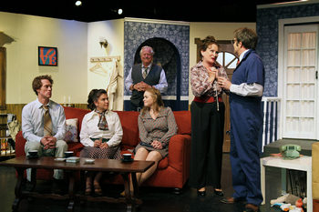 In 1999's House and Garden, for example, two plays run simultaneously in adjacent theaters, so that characters from the play that takes place inside a house exit to the garden (i.e., onto the stage of the neighboring theater) and characters from the garden go next door into the house, and back and forth. Innovative, indeed. But back in 1970, the equally clever How the Other Half Loves opened in London and put Ayckbourn on the map. Here, there's only one stage, but two distinct living rooms occupy it. The upscale one belongs to Frank and Fiona Foster. You never find out what kind of business Frank is in, but he's a manager of some sort and you can tell from the wallpaper and the tableware and Fiona's wardrobe that he makes good money. The other part of the stage is where Frank's employee Bob Phillips and his wife Terry and their young son live. It's pretty much a mess. Henry Avery, who also directed the show, designed a perfect set that allows the action in both living rooms to play out at the same time. Conversations are going on in both homes on the same stage and the actors crisscross in front of each other, but the script is so brilliantly written that it all seems perfectly normal and never gets confusing. Two dinner parties, one on Thursday evening at the Fosters, the other on Friday evening at the Phillipses, take place simultaneously at the same table. You have to see it to believe it. The play could be called a classic farce, except that there are only a couple doors. The plot is essentially a situation comedy: A little bit of adultery provokes a few little lies to cover it up, and a cascade of misapprehensions follows. It really is remarkably well written and hilarious. Neil Simon must have been jealous. The flow of dialogue and the flow of movement about the stage are all-important in this play, and Henry Avery has directed the actors so well that it all rolls along seamlessly. The English accents are good to boot. All of the acting is top notch, but the facial expressions of Michelle Volpe Roe, Yannig Morin, and Colleen Neary McClure are priceless. Clifton Chadwick as Frank has the very British conversational skill of beating around the bush down pat. Matthew van Wettering and Abby van Gerpen are equally fine as the exasperated Phillipses in a recurring "let's break up, then let's get together again" relationship. I've already mentioned the excellent set design by Henry Avery, but a lot of credit also goes to Mattie Roos who painted the set and Nina Dorrance who did the set dressing and props. The costumes by Chris Appleton are period perfect, and lighting design by Riley Lewis is unobtrusive and just right. I predict that at the end of this year, I will think back on all the shows I saw in 2025, and this will be one of the two or three best comedies of the year. Possibly the best. How the Other Half Loves, presented by West End Productions, runs through June 29, 2025, at the North Fourth Theatre, 4904 Fourth Street NW, Albuquerque NM. Performances are Fridays and Saturdays at 7:30, Sundays at 2:00. Tickets are $20 to $24. For tickets and information, please visit westendproductions.org. |
