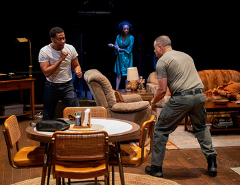 The events take place over the course of just a few days beginning with Buddy's return after a fifteen-year absence and leading up to a ceremony in which Vet, his father, is to be honored for singlehandedly bringing in a group of dangerous illegals with a truck full of guns. Although the two are wary of one another, Grace is optimistic about the possibility of her stepson and husband repairing the damage of the past. But each of the three characters is living a distinct fantasy world. Vet imagines himself a hero and leader as he endlessly rehearses the speech he intends to give, yet the reality that he sees life as a zero-sum game, and the only community he has is one born of silence and complicity regularly, intrudes. Buddy's letters have built him up as a tech bro who has found James Bond-esque success after an honorable discharge from the service, but his reality is something carved out of his attempts to cope with PTSD, joblessness, and fury at the worldview that drives his father to chase young men and families back across the border. Grace's world is one of stories clipped from the newspaper and collected from the patrons at the diner where she waits tables, and one she guards carefully from Vet. The three realms the characters inhabit emerge as incompatible in dire, volatile ways, but the build to the inevitable is funny, heartrending, tense, and anything but simple. The success of the multiple stories Parks has deftly woven together hinges on the setting, which never strays beyond the backyard of the remote house that Grace and Vet share in an unspecified border town. Arnel Sancianco's scenic design captures everything from the space that looms large in Buddy's childhood memories, which are fifteen years out of date, to the clean and comfortable, yet slightly shabby reality that confronts him when arrives. In the dated furniture and faded braided rugs, there is nothing of the Disneyland castle that features in Grace's book, yet the pairs of her not-quite-sensible shoes that sit visible on a rack near the hidey-hole for her book, the always-full coffee pot, and half a dozen homey details lend the set the magic necessary to connect the actual to the metaphorical. And for Buddy, whose footlocker that contains all that remains of the house he shared with his own mother until her death and his subsequent loss of it, the way that Sancianco manages to infuse a fundamentally stark and practical space with Grace's warmth marks an important and painful contrast. Jason Lynch's lighting and Curtis Craig's sound design provide outstanding complements to Sancianco's set. In the twilight as Grace or Buddy lingers in the yard, writing themselves into existence, the warped and weathered wooden deck glows an appropriately eerie and alien green. And the sun that Lynch moves ruthlessly over the yard party that never happens is every bit as critical as Parks' dialogue (and the cast's perfectly timed delivery of it) to the heartsore humor and ratcheting tension that move the story toward its conclusion. Sonically, Craig blends the natural and the technological so skillfully that the audience does not know from minute-to-minute whether the chirp they are hearing is desert insects, a smart phone, or some conversation between the two. The demands for costuming are minimal, yet Raquel Adorno's choices, from Buddy's stiff Levis and tape-repaired, military-issue glasses, to the family Hawaiian prints, to the red dress Grace fantasizes about shade in important visual details that fill out the characters. Similarly, employing the three video screens that surround the in-the-round stage, Rasean Davonté Johnson's projection design keeps the border wall as present in the audience's mind as it is in the lives of the family before them. The projection of Buddy's "Book of Snake," broadcasts from his iPhone on to these screens then almost, but doesn't quite, blot out the images of the wall. The end result is stark and effective without being distractingly on the nose. The real story here, though, is the cast, who do a phenomenal job, both individually and as an ensemble. As Grace, Zainab Jah is upbeat and forward-looking without her once coming across as in denial or anything less than a flawed, fully realized human. As skillful as Parks' text is, it is not difficult to imagine the character veering into the territory of the thinking man's manic pixie dream girl. But in Jah's delivery and what definitely comes across as Broadnax III's steady direction, this is never a possibility. A Vet, Brian Marable also creates a fully realized, lived-in human who is neither a two-dimensional caricature of a particular worldview nor simply misunderstood. Marable's delivery of lines we know to be projected into Vet by Grace is easy, natural, and believable every time. And just as engrossing is his reflection on what he views as his place in the order of things, as contrasted with the abuses he is fully aware go on around him all the time. If there is a weakness in the play it is, perhaps the fact that Vet's character loses complexity in the second act. But even here, Marable's work has the audience buying in, at least a little, to the terrible new relationship the character attempts to forget with Buddy. As Buddy, Namir Smallwood is exceptional. He brings out the very best in both Jah and Marable, as they bring out the best in him. The subtlety of his performance renders it believable that he could put on a suit and a bronze star and charm "the guys" at the wall, and yet every second he conveys the tragedy of the fact that Grace, and to a certain extent Vet, buys into the desperate act that he is putting on. And in his performances for the iPhone camera, the tenuous logic of his manifesto is painfully obvious, yet we believe that he believes. The Book of Grace runs through May 18, 2025, at Steppenwolf Theatre Company, Ensemble Theater in Honor of Helen Zell, 1646 N. Halsted St., Chicago IL. For tickets and information, please vis