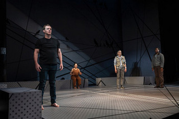 On the surface, the play is about terminal illness that debilitates and dismantles an individual's life along the way. Although the unnamed main character (Namir Smallwood, credited as Actor 1) seems to be relatively young, the angle that Diaz takes on the topic makes it abundantly clear that it is as much about life and aging (the debilitating terminal illness we all share) as it is about the ready-made tragedy of "untimely" illness and death. For example, the older woman (Amy Morton, credited as Actor 2) whom Smallwood's character pays to (among other things) bear the burden of telling his family that he has become sick (as his brother before him had) is fixated on her upcoming audition to play Dorothy in a stage production of The Wizard of Oz; another older woman (also played by Morton much later on) has lost her husband to a giant bird who has carried him off; and a co-worker of the main character (Sadieh Rifai, credited as Actor 3) resents all that she is called on to do for her aging father. In wrapping its arms around this universal theme, in taking on the intriguing, productive angle of the terrible social burden thrust upon the dying to explain their situation to others and explain it again and yet again, and in shining a light on how transactional the very idea of care has become in contemporary society, the play is brilliant at times. However, although the surrealism that Diaz incorporates often rings true enough to contribute to that brilliance, there are times when the play seems to indulge in absurdity for its own sake or in a way that seem to make emotional and intellectual promises that the text does not quite fulfill. Morton's character, for example, maneuvers Smallwood's character into attending her acting class so that her own usual partner's illness won't result in an uneven number of people in the class. The teacher sets the class on a series of movement exercises, and the scene is both funny and generative as it offer insights into physical limitations that are encroaching on Smallwood's character. But it also seems to promise to shed light on Morton's character and her desires and motivations without really doing so. Similarly, in the scene in which Morton's character reluctantly agrees to meet with Smallwood's character and his sister (also played by Rifai) to deliver the news of his illness, there's an extended bit with a crying waiter (Cliff Chamberlain, credited as Actor 4) that ends up feeling rather aimless, and Polly's reaction to learning that she is poised to lose a second brother to illness is written too broadly to make much sense of and is further undermined by the fact that Rifai is called on to almost instantly shift into the role of "Teacher Taylor," who runs the acting class. Despite the imbalances in the play itself, Steppenwolf's staging is, as ever, masterful. Andrew Boyce's scenic design is deceptively simple, but in that simplicity it manages to evoke vibes ranging from German expressionism to Hitchcock with its off-kilter grid and telephone lines, outsized bird silhouettes, and dynamic vanishing points. The transition to Smallwood's character's "first home" is nothing short of spectacular, and throughout the show, Jen Schriever's lighting and Willow James's sound design support Boyce's visuals in crafting a sense of foreboding and oppression. Credit also goes to Skylar Fox for the magic and illusions design, which contribute effective moments of lightness. Raquel Adorno's costumes, unfortunately, seem curiously out of step with the otherwise strong production. Morton's character seems to be dressed in a khaki vest with numerous pockets and patches of some kind, and although her jeans seem to be simply grey or black stonewash, they initially read as military camouflage in conjunction with the vest, but this does not seem to have much to do with the character. As Polly (Smallwood's sister), Rifai wears an ostentatious fur of some kind, and later a different character she plays wears a camel hair coat draped across her shoulders, but it's not clear what this is meant to signify, other than wealth that doesn't seem particularly important to either character. Smallwood and Morton lead the production with strong performances and engaging rapport. Smallwood's physicality is particularly impressive, as the conventions of the play require him to respond to the second-person narration of experience by another actor (Jordan Arredondo, credited as Actor 5), who is offstage through most of the play. This careful, painfully in-his-own-head depiction is balanced by Morton's broad, hard-nosed character. Although Chamberlain plays characters who are sometimes central to some of to moments in the play that are a bit tonally uneven, he lands the intended comedy with skill that goes a long way toward salvaging them. Later in the play when he plays both a character whom Smallwood mistakes for his former lover as well as the lover himself, Chamberlain also shows his range. Through no fault of her own, Rifai does not have much to work with; despite the fact that Smallwood's character's fear of revealing his illness to his sister is theoretically the play's inciting incident, the scene in which this happens is arguably the weakest because the sister character is not well fleshed out. Rifai's capabilities are clear when she plays both "Teacher Taylor" and Smallwood's co-worker, but these characters, too, are not as well rendered as others in the play. The conceit of the narration from offstage is an interesting one, and it pays off in the penultimate scene as Arredondo and Smallwood have the opportunity to connect on stage. The work they do is impressive enough to lead one to wonder if reallocation of time and attention from some of the more purely absurd scenes to this relationship would have added a layer of depth to the play overall. You Will Get Sick has been extended through July 20, 2025, at Steppenwolf Theatre Company, Downstairs Theater, 1650 N. Halsted St., C