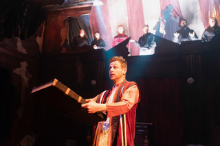 Although the show has always had its skeptics and detractors (sprinkled in among the much more common, and deserved, adulation), it seems clear that Kushner's work has aged much better than some pieces born of the Reagan era in general, and the AIDS crisis more specifically. And yet it would be damning with faint praise to hint that Invictus succeeds here simply as a downstream effect of that commendable staying power. There is a love in this work for thought and for language and for stumbling in the dark to find one's voice and a way forward in a punishing world. Under Askenaizer's direction, this cast honors and realizes that love with skill that is thrilling to watch. As ever with Invictus, that success in terms of the thing itself rests on care and creativity in how the piece is presented. Kevin Rolfs' set is a dark, moody ruin of America. Much of the upstage wall is dark wood with decaying elements borrowed from classical Greek architecture as a nod to America's selective self-mythologizing. There are vicious bites ripped out of various parts of the set, and the whole of the space is haphazardly shrouded in cloudy tarps. These bleed into the ruin of the stripes of the American flag just above two half-sized prosceniums. One of these opens onto a miniature stage that Roy Cohn dominates throughout Part One and that other characters occasionally cling to the edges of. The other proscenium, set two steps down and stage left of this, is the floor-level domain of Louis and Prior, and later Prior without Louis, as the former is shuttled back and forth between the hospital and the apartment that Louis has abandoned. The upper-left corner of the stage is occupied by a precarious set of stairs leading to a high platform that variously represents a shadowy corner of Central Park, a bridge overlooking the Hudson, a porch in Salt Lake City, and ultimately, Heaven. The overall effect is of a city and a nation and a set of lives not just crumbling, but being consumed from the inside out. G. "Max" Maxin IV's projections build on this. They are by turns playful, as when Mr. Lies first bursts on the scene and a hot pink and violent teal grid design that is vintage 1980s splashes across the upstage portions of the set, and beautiful if unsettling as when Prior is gradually drawn further into his connection with the Angel. In the latter case, the set seems to swirl and pulse with life, and Prior's visual sense of the Angel gradually resolves into an enormous eye. In Part Two, as Prior rouses himself to wrestle with the angel, the space boils with the stuff of creation and the language of God. Brandon Wardell's lighting is also critical to a physical design that works beautifully. The space is mindfully and deliberately claustrophobic, challenging even the polite illusion of privacy. Characters linger on stage, living through their suffering as the anguish of others takes focus and lurches forward. Wardell's lighting directs the audience's attention with skill, but never lets the other tragedies that are constantly unfolding wander far from our minds. Petter Wahlbäck's sound design is equally deft in creating the ever-present sounds of New York and knowing just when to make those sounds push into the audience's consciousness. All of these elements–set, sound, lighting, and projections–work effectively throughout both parts, but the truest culmination comes in a literally earthshaking climax to Part One. The costume design by Jessie Gowens and the wig and makeup design by Hannah Andruss also succeed across multiple dimensions. Gowens and Andruss certainly capture the essence of the 1980s through the show's women and Belize, nurse and once and future drag queen extraordinaire, even as they nail the static timelessness of male privilege in Joe's suit and camel hair coat. And yet, even these elements are dynamic, as Harper's house clothes are in conversation with the color block dress and wide belt she wears as she leaves New York, and Belize's scrubs with pop speak to the retro getup that Emily, Prior's nurse, sports. But the greatest triumph is in the costuming for the Angel, which is a marvel not just of sight but of sound and sheer occupation of space, whether she is a seemingly benevolent messenger, a fountain statue, or the much darker figure that Prior must later wrestle with. it's difficult to say enough in praise of both the performers and the direction here. Ryan Hake (Prior Walter) and Michael D. Graham (Roy M. Cohn and others) are the leads, and however orthogonal their characters may seem to one another, and how nonexistent direct interaction between the two is, their performances speak to and complement one another in fruitful ways that are an unexpected delight. Hake has no fear at all of leaning all the way into the role of the man whose WASP identity affords him a certain amount of cover in adopting the role of the queen. And for as much play as there is with the rhetoric of butch and queen and Marlboro Man and fairy, the drama of the high-powered fixer that Graham brings to his rendition of Cohn bounces off Hake's choices in ways that invite all kinds of delicious introspection. Both Hake and Graham also excel in their direct scenes with others. Hake's ability to conjure up genuine, gut-wrenching suffering, even as he, bedridden, calls up Dorothy and Blanche DuBois and other high-camp figures, does Nicki Rossi a great service in helping to bring to life not just their blistering, terrifying, deeply awkward Angel, but also their down-to-earth Emily, Prior's compassionate, yet no-nonsense nurse. In the same vein, Graham's unabashedly wretched Cohn is shot through with pervasive fear. This unnervingly well-done portrait of a soulless abuser gives Joe Bushell the opportunity to add depth to his performance and a modicum of strength of character to Joe Pitt, who alternately resists Cohn and craves his paternal stamp of approval. But Graham's frantic and constant self-justification in all t
