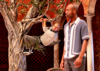 Tom Piper's scenic design and costumes lean into the truth, universally acknowledged, that ridiculously attractive men just home from war are in want of equally attractive wives. And to find them, these men naturally journey to the idyllic homes of their wealthy friends. Piper's set occupies not just the thrust of CST's Courtyard Theater, but bypasses what productions often employ as the proscenium all the way to the upstage wall of the theater itself. Furthermore, Cadell's direction spills over into the audience, filling the space to the rafters. On the main level, guests enter into Leonato's estate via doors that are two stories high and accommodate dramatic entrances, complete with smoke effects. Surrounding these necessary instruments of high drama, Piper has constructed a double-decker series of arches. Those on the main level are tall and spread out. On the upper level, where the play's intrigue happens (or at least is observed), the arches are shorter and more regimented. The highly realistic tree that sits upstage left, in conjunction with the terra cotta tones of the set overall, establishes that the action, so far as the play's most privileged characters are concerned, takes place in a liminal "vacation" space. And yet, the deception and listening in that occurs in the visually more frantic upper level of the set remains in tension with this vacation vibe. Piper's costuming choices, particularly for the women of Messina, are also effectively liminal. Their high-waisted skirts, wide-legged pants, and the angular lines of their dresses suggest the roughly 1940s aesthetic of a society just emerging from war. Moreover, Piper employs metallic fabrics and cuts that range from demure to daring in the moments when the women of Leonato's circle are serious about the business of marriage. He then juxtaposes these with bold, flowing garments, often featuring naturalistic elements when the women are off the clock, as it were, and free to associate amongst themselves. In contrast to this intelligent richness for the women, the men's costumes are cheekily standardized. When Don Pedro and his retinue arrive, their grey uniforms are pointedly drab and nondescript. Don John and his co-conspirators are distinguished primarily by the dominance of black in their costumes and a tendency toward generically Asian lines. This opens up space to emphasize, for example, Claudio through his "resort wear" when he is confidently at rest, as well as Benedick's outlandishly snazzy costume after he has been ensnared by Don Pedro's scheme and has set his sights on Beatrice. Given Piper's splashy, entertaining successes, it would be easy to overlook other elements of the production design. Yet the sound design (Nicholas Pope), musical compositions (Eliza Thompson), and lighting (Jason Lynch) are important parts of the production's sparkling vibe and flawless pacing. Given the satisfying emphasis on play in Cadell's direction, Lynch's lighting is integral to the rapid shifts between the pranksters and the pranked, as well as between the frothy comedy and the darkness Shakespeare offers. Likewise, Pope's sound design playfully weaves Thompson's music throughout the dialogue and fills the space with it, conveying the message that mischief may be afoot at any given moment. It's a genuine pleasure to settle back and watch Cadell and her cast play with some of Shakespeare's very best material. That pleasure obviously starts with Deborah Hay's Beatrice and Mark Bedard's Benedick. The two are masterful in capturing the reality that both characters are a bit more road weary and cynical than the young lovers who "should" be the focus of the romantic plot, and yet beneath the armor of their wit, each has a tender, loyal heart that gravitates toward love. In particular, Hay's comedy hearkens back to the broad, physical style of geniuses like Lucille Ball and Carol Burnett (kudos to movement director Amber Mak), and she is equally impressive and believable when she dials her personality down when Beatrice's ferocity and frustration turn dramatic. Bedard is similarly skilled in playing Benedick's swagger for all it is worth, even as his inner dork peeks through. And yet, in the scene where he confronts Claudio at Beatrice's behest, there is genuine steel in a performance that is believably connected to both the man who so capably spars with Beatrice and who falls so readily into the trap Don Pedro and his confederates set for him. With Hay and Bedard setting the comedic bar so high, Cadell affords the rest of the cast ample room to play as well. The "straight" characters like Don Pedro (Debo Balogun), Claudio (Samuel B. Jackson), and even Don John (Erik Hellman) seize every opportunity to wink and nod at the audience, as well as to actively involve them in their various schemes. Yet none of this embrace of the comedy compromises the darkness that infuses the story. Balogun seems to be all charisma until the chillingly effective moment when the force of his personality turns against Hero. This plays in an especially interesting way against Kevin Gudahl's performance as Leonato, ever the jovial father and host until he, too, immediately believes the worst of his own daughter. Also important in this mix is Jackson's undeniably attractive yet deliberately bland Claudio. In a role that can easily become a broad strokes plot device in the wrong hands, Jackson does excellent work using his physicality to convey why Hero, and the people of Messina more generally, would be smitten with him, but he also plays with the subtleties of Claudio's whipsawing moods, not only when Hero's virtue is impugned, but also when he believes, with little prompting, that Don Pedro has betrayed him. Counterbalancing the shades of darkness in these performances, Hellman plays the villainous Don John as really rather stupid and unconvincing (in the best possible way). The choreography of the scene in which he formulates the plot with Borachio (Yona Moises 