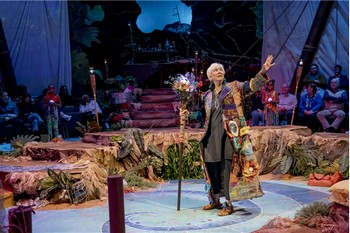 This Tempest is performed in the round on a colorful Caribbean island set designed by Samantha Reno with sustainable intentions. The exiled magician Prospera (Leslie Brott) has conjured a terrible storm to wreak vengeance on the enemies who marooned her there. The shipwrecked survivors wander, comically bewildered, amidst the flotsam and jetsam of contemporary culture. A program note indicates that the set, costumes and props were made from recyclable and repurposed materials, all of which can be sustainably recycled when the show is over. Shakespeare's central character was a man, Prospero, but in director Candice Handy's staging, Prospera, still powerful and initially vengeful, is now softer and ultimately generous. She carries a magical staff topped with an abundant floral arrangement. Brott gives the role a stately, warm performance, demonstrating a mother's love for Miranda (Dani Grace Nissen), her sweetly naïve teenage daughter stranded with her a dozen years earlier. With the magical aid of a sprite, Ariel (played with airy delight by Hannah Gregory), Prospera engineers a romantic encounter between Miranda and handsome young Ferdinand (Jason Coffenberry), the offspring of one of her rivals for power in Naples. To prove his love for Miranda, Ferdinand is called upon to move heavy logs. Actually represented by small pieces of cut wood, they prove to be a challenge that he hilariously and clumsily struggles to handle. The Tempest contains some of Shakespeare's most amusing comic characters and moments. Sara Mackie plays Trinculo, a jester, and antic Cary Davenport is Stephano, a drunken butler. They are paired with Sylvester Little Jr. as Caliban, an island native whom Prospera has enslaved and transformed physically into a hissing, repellant reptile. Davenport's tipsy, kazoo-enhanced musical engagement of the audience, as he marches around the stage's central pool, is cause for great hilarity. Mackie's rough-and-tumble jester, hiding under a tarp with Sylvester's fearsome Caliban, is also especially amusing. The trio haplessly plot to take charge of the island, but they spend more time drinking, cavorting, and being distracted by Ariel's invisible interference. The shipwrecked entourage–Jim Hopkins as befuddled King Alonso, Joneal Joplin as his wise elderly brother, and Jeremy Dubin and Jasmine Bouldin as a pair of scheming courtiers–wander the island in search of others. They are repeatedly misled by Prospera's magic and Ariel's manipulation. Gregory's fluttering performance as the sprite, often nimbly climbing on remnants of the ship's rigging and enjoying the mischief she is imposing, sustains the production's rapid momentum. A Cincinnati troupe of talented Black youngsters, the Q-Kidz Dance Team, are the tiny dancing indigenous inhabitants of the island. These half-dozen pint-sized players, delightfully choreographed by Darnell Pierre Benjamin and augmented by actor Aiden Sims, often encircle the characters, sometimes supporting the action (they hand discarded golf clubs to Dubin and Bouldin to use as weapons in a failed assassination plot) and other times underscoring the action's ebullient emotions. When Little's Caliban is freed from his enslavement, they become his band of supporters to take back to their island. These young dancers are an essential element of the show's visual and moral impact, and they are fully and meaningfully engaged in the action. The Tempest benefits significantly from Chris Guthrie's sound design, from the rousing storm's theater-rattling thunderclaps and roaring wind–already sounding as audiences enter the theater–to twinkling sounds as Ariel comes and goes on mischievous missions. Andrew Hungerford's lighting design builds the moods of various scenes. Robert Carlton Stimmel's projections enhance the storytelling with images of turbulent ocean waves and island greenery. They are shown on a pair of shredded sails, as well as a video screen on the face of the balcony viewable by theatregoers seated onstage. Costuming by Rainy Edwards and Kayla Cieslinski contributes to the characterizations, using colorful fabric remnants for the island's inhabitants (Prospera's magical cloak is a gorgeous patchwork of materials) and modern vacation wear for the shipwrecked players. Composer Aleah Vassell's music adds further entertainment, some lighthearted and some heartfelt, especially a song Gregory performs reflecting Ariel's yearning for freedom. At the play's conclusion, Brott's Prospera leads a joyous dance, first with the Q-Kidz dancers following her movements, and then the other actors joining in one-by-one or two-by-two, with their own madcap reactions to the music. By the time all are assembled on stage in manic motion, the audience is on its feet, clapping and joining in the fun. Shakespeare's enchanted Tempest is receiving an enchanting staging by Handy and her well-rehearsed cast, one likely to move audiences young and old–and to stick in memories for a long time to come. That's another kind of sustainability. The Tempest, runs through May 4, 2025, at Cincinnati Shakespeare Company, Otto M. Budig Theatre, 1195 Elm Street in Cincinnati's Over-the-Rhine neighborhood, Cincinnati OH. For tickets and information, please visit www.CincyShakes.com or call 513-381-2273. |