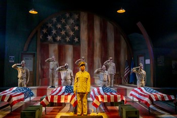 But in this production staged by Cincy Shakes veteran director Christopher V. Edwards, the tone is far from jocular or patriotic. Silhouetted in an opening scene, we see a drunken soldier in a violent exchange with two others, resulting in a brutal execution. The story follows virtuous and committed Captain Richard Davenport (K.P. Powell), arriving to handle the investigation and potential prosecution of the murderers. He's a rarity, a Black Army officer, and his greeting by a white man of parallel rank, Captain Charles Taylor (Brent Vimtrup, performing with fierce, frustrated opinions), is not welcoming. Taylor admits that Davenport is the first Black officer he has ever met, and he questions the choice of Davenport for reasons of racism and likely complications in a white town where the initial suspects are Ku Klux Klansmen. But the steely Davenport, a Howard University educated lawyer, proceeds as the mystery of Sargeant Vernon Waters's murder is unraveled through flashbacks. Davenport interviews each of the soldiers in the unit–handled through dimmed lighting shifts (designed by Jessica Drayton and Kassidy Schley) for flashbacks representing various perspectives preceding the murder. No easy conclusions are possible. Two officers become suspects, Captain Wilcox (Carey Davenport) and fiercely racist Lieutenant Byrd (Patrick Earl Phillips), but Davenport has pieced together a different scenario. It's evident that Waters, played with impatient vile by Geoffrey Warren Barnes II, is a harsh leader of the unit, a man who loathed his recruits whom he saw as Uncle Toms, old-fashioned racist stereotypes. Recollections show Waters literally combative with impetuous Melvin Peterson (Anthony T. Gross) and angrily dismissive of gentle, naïve musician, Private C.J. Memphis (Montez Jenkins Copeland), who is goaded into an attack that results in detention and death. The cast is populated with talented Black actors, a demonstration of Cincy Shakes' continuing strength with ensembles that enable productions of classic works about Blacks to succeed. Others performing in A Soldier's Play include "ranney" as subservient, jocular Private James Wilks, Sylvester Little Jr. as docile Corporal Ellis, Jason Coffenberry as forthright Corporal Bernard Cobb, Malik Smith as Private Louis Henson, and Jay Wade as Private Tony Smalls. They constitute a convincing ensemble representing a range of minority behaviors in the 1940s. Keisha L. Kemper is the production's military consultant. She has sharply detailed the actors' performances with a snap-to-command, stiff-spined physicality that adds authenticity to the storytelling. Military behavior, especially deference to rank, produces uniformity and disciplinary structure. But it is also the enemy of the truth-telling that Davenport requires as he determine what led to Waters's demise. As the story unfolds through flashback episodes, Davenport wrestles with grasping what really happened, ultimately coming down to an unanticipated conclusion, one that surprises Taylor, who is man enough to admit he was wrong to doubt Davenport's ability to handle the investigation at the story's conclusion. A Soldier's Play was considered too difficult for a Broadway production in 1981; it debuted in an award-winning Off-Broadway production and became a well-received film in 1984 (A Soldier's Story), nominated for three Academy Awards. The play was finally produced on Broadway in early 2020. It's an important work, one that examines Black identity and the historic complexities of race relations in America. Waters is virulently prejudiced against Black men he sees as shiftless and discredits to their race. He believes his harsh behavior–modeled on white men's racist behaviors–will advance him in the military. But his dying words–easily misinterpreted in the murder investigation–are "They still hate you." His tortured realization was that no matter how hard he tried to emulate racist behavior, he would always be the victim of such attitudes. The psychic damage done to several characters is the dismaying driving force behind Fuller's powerful script. For a stage work that's been around for more than four decades, A Soldier's Play remains today a stark, powerful reminder that racism comes and persists in many forms–and colors. It remains a factor in contemporary American life, despite efforts of some to whitewash our past and fantasize about an unrealized present. A Soldier's Play at Cincy Shakes is a powerful, meaningful piece of theatre for audiences in Cincinnati in 2026. A Soldier's Play runs through February 15, 2026, at Cincinnati Shakespeare Company, 1195 Elm Street, Cincinnati OH. For tickets and information, please visit cincyshakes.com or call 513-513-381-2273. |