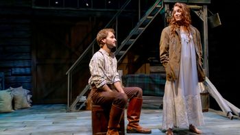 Aaron Schilling plays Charlie Edwards, a rough and tumble young farmer who fantasizes about being a military hero on horseback. Britian Seibert is Mary Chalmers, a strong-willed, independent young woman transported from London to the wilds of Canada by a stern mother who has high expectations for her daughter. The pair first meet during a thunderstorm that terrifies Charlie, who counts the seconds between lightning and thunderclaps. Mary calms him by pushing him to recite some poetry, but the only verse he has memorized is Tennyson's "The Charge of the Light Brigade." It works, but it also foreshadows Charlie's fate as a cavalry soldier who perishes in an ill-fated brigade's valiant effort to resist a German advance into France. The romance between Mary and Charlie predates the outbreak of war on a day when he gives her a ride on horseback. Although there's no horse onstage–they mount a gate draped with a horse blanket–the actors' physical and emotional response to a sturdy ride galloping across the Alberta countryside is easy to imagine. Mary knows nothing of horseback riding, and shy Charlie steps up to help her learn. But their shy love affair is interrupted when the Canadian Cavalry Brigade is called upon to be part of the war effort and Charlie ships out with the troops. Scenes of horrific wartime conflict–poison gas, machine guns, trench warfare–are vividly reimagined in the most impressionistic way, often begun by letters from the European warfront that Charlie sends back to Mary that alternate in dreamlike fashion with the lovers' courtship before the war. As the words of his letters become real, Seibert occasionally dons a military jacket to become Charlie's friend and commanding officer, Gordon Muriel Flowerdew. She changes her demeanor and voice when she transforms into the kindly, compassionate military man. (Flowerdew was the real-life leader of Strathcona's Horse Company C, who died valiantly in battle in March 1918 and received the Victoria Cross posthumously.) Seibert and Schilling, guided by director Blake Robison (the Playhouse's producing artistic director), turn in heart-tugging performances as lovers in a time of desperation, separation, and longing. They are believable and changeable, both with expressive faces that broadcast a vast array of emotion and movement that convince you they're riding horses. The 100-minute production (no intermission) is a wild emotional ride to a wrenching conclusion, and there were sniffles and tears in evidence onstage and off as the actors took their curtain calls. The Playhouse's Rosenthal Shelterhouse Theatre is the perfect intimate space to stage this production where all the action is just a few feet from the audience. Lex Liang's scenic design–a gray, rough-hewn horse barn wall with sliding doors, a plank floor, steps to an upper level, and farm implements scattered here and there–set the rustic tone for the story. There are moments when Robison has the actors step off the platform into a space off the edge of the stage. At these moments, they telegraph the characters' powerful emotions as they stand close to the audience in almost confessional moments. (Liang is also the production's costume designer, including the delicate, virginal white-on-white ankle length nightgown that Seibert wears, a constant reminder that barefoot Mary is dreaming.) Moody, expressive lighting (designed by Michelle Habeck) helps to delineate between the nostalgic scenes of first love and the traumatic moments of battle that Charlie experiences. In the opening scenes, Charlie's fear of thunderstorms is underscored by flashes of lightning and rumbling thunderclaps (Matthew M. Nielson designed the sound.) Mary's Wedding is not a new play. It debuted in Canada in 2000 and won several awards there. Local audiences saw it in 2008 when it was memorably produced by Ensemble Theatre Cincinnati. We should be grateful to see this poetic, deeply moving work again in this beautifully evocative production. Mary's Wedding continues through March 8, 2026, at Cincinnati Playhouse in the Park, 962 Mt. Adams Circle in Eden Park, adjacent to Mt. Adams, Cincinnati, OH. For tickets and information, please visit cincyplay.com or call 513-421-3888. |