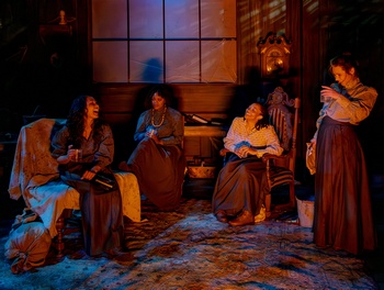 They refer to themselves as "The Sisters of Bedlam," referencing a notorious mental institution that often took in women whose families could not cope with their brash personalities and outspoken opinions. Bethany (Tierra London Rush), Nora (Abi Esmena), Emma (Meredith Frankie Crutcher), and Hazel (Jordan Trovillion) are on the run. There's nothing unstable about them: They are articulate and passionate but, finding themselves sheltered in a deteriorated building with a creepy reputation, they begin to question their own sanity after Meredith relates a disturbing tale about "Old Abram Brown" in "a long brown coat," who might have committed suicide in the Ravenside Inn years earlier. Eerie sounds (Doug Borntrager is the sound designer) and a menacing musical score sustain the mood from start to finish. The music by Jimmie A. Parker Sr. was performed and recorded by a string quartet from Cincinnati's concertnova ensemble. The soundscape constantly renders the four women in a constant state of panic, imagining that a restless spirit is haunting the place. Snow's script, directed by Caitlin McWethy, has been promoted using a question that playwright Snow formed: "A play about a ghost?" That's certainly the direction the story seems to be heading with shadowy lighting (designed by Charlie Raschke) and a foreboding, dark scenic design (Gabby Trice). Know seldom puts as much detail into a set as this one: The interior of the Ravenside Inn is a shadowy gray space, full of draped antique furniture, a grandfather clock, cobwebs, and swirling mists. The actors enter, clinging to each other, wearing full-length Victorian nightgowns, down steps on the right side of the audience. A large wood-burning stove planted in the middle of the front row of seats emits a flickering glow that illuminates many of the scenes, perfect low illumination for retelling the tale of Abram Brown. The actors constantly perform at a nervous fever pitch, chattering and shrieking in response to various jump scares prompted by their unnerving surroundings. They speak with well-rehearsed Cockney dialects (coached by Julia Guichard), but there are a few too many moments when their heightened emotions affect intelligibility. The second act begins with a flashback of 20 years to three narrow-minded local men (played by Crutcher, Esmena, and Trovillion) expressing their disdain for Abram Brown. The scene has an emotional arc, but it feels awkwardly inserted as an explanatory gesture. The characters' mutually supportive interactions provide numerous moments of meaningful conversation about misogyny and racism. Esmena's feisty, quick-tempered Nora favors escaping the seeming terrors Ravenside, while Trovillion's pragmatic Hazel does her best to calm the women's nerves and keep them in a sheltered space. As Emma, Crutcher's lurid storytelling lays the foundation for her friends' fears, and Rush's sensitive Bethany is most vulnerably sympathetic to Abram Brown's plight. She becomes wholly attuned to his circumstances in a breathtaking dual monologue (performed with Phillip Latham) at the show's climax. Asked in a radio interview what he hoped people might take away from his script, Snow said it's about "dealing with erasure," a theme he feels is every bit as timely today as it might have been in the past. (In fact, Snow was himself haunted by a Benjamin Britten song he performed in a choir in the fifth grade; as a nursery tale and a sung round, it seems to have originated centuries earlier.) The act of remembrance can be powerful, and its obverse is often painful. He hoped his play would serve as a reminder that "you were here," that your existence mattered. That comes through in the final frenzied, danced moments of The Ravenside Occurrence. Snow's script was commissioned and developed in a workshop production by the Cincinnati Playhouse in the Park through its Jerome Fey Play Collective Fund. The Ravenside Occurrence, produced by Know Theatre of Cincinnati, runs through April 18, 2026, at the David C. Herriman Center for the Performing Arts, 1120 Jackson Street, Cincinnati's Over-the-Rhine neighborhood, Cincinnati OH. For tickets and information, please visit knowtheatre.com or call 513-300-5669. |