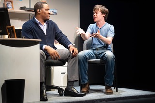 Hunter has set the play in his native Idaho, as Keith (Kayodè Soyemi) and Ryan (Steven Lee Johnson) face one another in a tiny office nook or corner. Ryan hopes to buy a bit of land, thinking this might recharge him. He believes his grandparents once owned the parcel. Divorced a short time back, he hopes to have Krista, his young daughter, with him. He does not know if he will gain custody of the child. Otherwise, Ryan is down on his luck and fortune since he works at a nondescript yogurt factory of sorts and has poor credit. Keith is a mortgage broker and clearly explains to Ryan that he is not a lender. He has been a foster father to Willa and hopes to adopt her. Keith is smart and articulate but, in his own way, as desperate as Ryan. These men were in school together a number of years back, and now their little daughters, under two, are in the same daycare. Ryan is white and straight while Keith is Black and gay. For quite a long time, they parry. Ryan is more obviously distraught but Keith becomes agitated as well. They are both single men who try, somehow, to rejuvenate, to enrich their lives. Keith tries to give Ryan fiscal options but Ryan is slow on the uptake when it comes to understanding the specifics. The characters sit and talk, sit and talk while tension escalates and then recedes. At one point, they do some drinking. Ryan wonders whether "there's good left in the world." That is most apropos: Keith, on the surface, looks smoother while Ryan, wearing jeans, wears his emotions upon him more vividly. Playwright Hunter eventually provides a cathartic moment for Keith. The question, however, is whether or not Keith's release of pent-up feelings will lead to a more positive situation. Thematically, the play focuses on control. Ryan sits in his chair forlornly but, in a flash, reveals intent, to keep Krista, through Hunter's words and his own facial expression. For now, Ryan is down but not absolutely out. Keith does have a job but it becomes obvious that he could lose all of his joy, the child called Willa, in an instant. Should adoption fail, Keith will crash. Bruce Springsteen entitled a song "Land of Hopes and Dreams." Both Ryan and Keith need circumstances to resolve favorably in order to realize hopes and dreams. Samuel D. Hunter (who wrote the play The Whale and the screenplay for the award-winning film of the same name) provides quick, catchy dialogue. For the longest while, Keith and Ryan remain seated. Director Daniel Elihu Kramer does have the opportunity to apply his skills to include movement during final scenes. The director has wisely coached the two actors to keep pushing the dialogue. Snappy pacing carries the story forward. Both of the actors hold an MFA from the David Geffen School of Drama at Yale. Kayodè Soyemi has a number of regional theatre credits and a background in producing, too. Steven Lee Johnson was in the Broadway cast of To Kill a Mockingbird and also has appeared on regional stages. He is cast as Charlie when Stereophonic begins its first national tour journey this fall. This intriguing production reaches into the souls of two men but manages to avoid melodrama. It is by no means a stretch to see these individuals as friends. The play, through strong performances, pulls in theatregoers from the get-go. Hunter has written words for anguished yet compassionate men who are clinging to even a ray of hope. A Case for the Existence of God runs through August 3, 2025, at Chester Theatre Company, 15 Middlefield Rd., Chester MA. For tickets and information, please call 413-354-7771 or visit chestertheatre.org. |