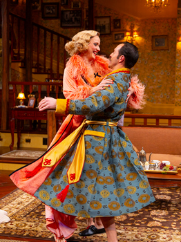 Set designer Tim Mackabee's beckoning interior of a cottage an hour and a half away from London in 1923 is exceptionally rich. Complete with couches, rugs, many lamps, a stocked bookcase, lovely stairway, gramophone, and much more, the place looks like a vacation home anyone would love to have. Call it sumptuous. Sylvia (Mary Cavett) and Beau (Jordan Sobel) have been lovers for quite some time. The house might actually belong to Beau's mother. His name for Sylvia is Tulip and she is quite at home wearing a pink lingerie type garment (thanks to costume designer Hunter Kaczorowski) early on. Sylvia seems to favor telegrams as her means of communication. She sends one to Clarke (Craig Wesley Divino) advising him that she would rather couple with Beau. She also informs, via telegram, the pregnant Marjorie (Kate MacCluggage), who is Beau's wife. It's not all that shocking that everybody congregates at the cottage and that will include audacious Dierdre (Jetta Juriansz) and her former husband Richard (Matthew J. Harris), who also goes by William. Director Zoë Golub-Sass's pacing is brisk and she allows her high-energy actors plenty of room to carouse and cavort. She supplies specific movement so that performance is both disciplined yet simultaneously quite breezy in feel. The play is most absurd at times and a commentary, one might say, about marriage and, well, cheating. Toss in secrecy as well. Toward the conclusion of the production, it's clear that Sylvia is a wise, perceptive woman. Farce typically includes gymnastics, and this cast includes actors who adeptly move around and about, sometimes jumping over sofas. The form often addresses social roles. The Cottage dispenses with propriety very early on. Mary Caveat's Sylvia is a woman who, at first, seems haughty and snobby. On the other hand, she knows what or, more properly, whom she wants. Sylvia is both romantic and determined and, compared to everyone around her, mature. She might have some vision of the future while other characters react to specific moments. Jordan Sobel depicts Beau as one who is spry and sporty. Kaczorowski has outfitted Craig Wesley Divino in a nicely tailored suit for his role as Clarke, but the character is loud and outrageous. Marjorie will soon give birth, and Kate MacCluggage plays her as one who minces no words. This woman is direct with her sarcasm. Jetta Juriansz seems to have a giddy time playing Dierdre. Proclaiming herself to be a prostitute, she's the uninhibited extrovert who will kick up her heels and more. Without divulging plot detail, it's best to say the Matthew J. Harris demonstrates much versatility as Richard. The Cottage consistently zeroes in on who is loyal to a marriage and who is not. Playwright Rustin chose 1923 when, in Great Britain, a woman could get a divorce paper for a man who was unfaithful. Thus, if a woman's husband was adulterous, she could file a petition to divorce him. During the previous 65 years or so, a man could utilize the procedure if he found his wife was unfaithful but a woman was unable to follow that practice. The playwright has made reference, in her notes, that farce can be powerful and says, "I will be exploring farce through a feminist lens." Kate MacCluggage, playing Marjorie, has been featured at Hartford Stage multiple times while the other performers (all proficient) are making their debuts here. Dialect and voice coach Julie Foh should be commended as actor accents are true. Each of the characters has his or her own take upon romance, sex, passion, desire, and what love might mean. This type of comedy goes full throttle with sight gags, jokes, and lowbrow clowning around. This becomes infectious for theatregoers who simply wish to laugh. While this farce does not include slamming of entrance and exit doors, the gags caused by confusion carry the day. The Cottage runs through February 8, 2026, at Hartford Stage, 50 Church St., Hartford CT. For tickets and information, please call 860-527-5151 or visit HartfordStage.org. |