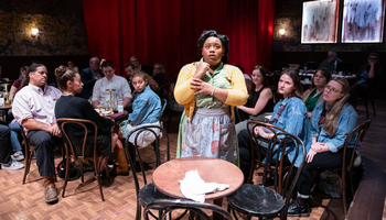 While most of the play's action takes place on two designated stage areas, audience members sit at small, four-person tables, and the actors make their way around them. More than that, the audience experience can include ordering drinks and snacks either before the show or during intermission from a bar located along one wall. (The production is immersive but not interactive; attendees are warned not to make direct contact with the actors.) The play is a fascinating blend of drama and psychological insight. Paradise is one of several nightclubs in the city's rundown Black Bottom neighborhood, and the (white) city government is interested in "urban renewal" or, in practical terms, buying up the existing buildings and leveling them to make room for new construction. The character at the heart of the drama–Blue (Amari Cheatom), a talented trumpeter–inherited the club from his father, also a trumpeter and a deeply troubled man whose actions live on in his son's memories and behavior. Director Raymond O. Caldwell ingeniously demonstrates the hold of the father's memory on the son: Cheatom visibly mimes playing the trumpet on the stage while performer Michael A. Thomas plays from among the tables. Blue, with his lingering traumas and need for transcendence, is the center of the play, as the others are his employees and, in the case of Pumpkin (Kalen Robinson), also his ambivalent lover. Pumpkin's jobs include tending bar, looking after the apartments available for rent upstairs, and cooking meals for the residents; she manages to find respite by reading poetry. Pianist Corn (Marty Austin Lamar) and percussionist P-Sam (Ro Boddie), with their bawdy interplay and dark humor, are tired of Blue's complete control over the musicians, firing one he considered a troublemaker. Then something unexpected happens: Silver (Anji White), a dangerously self-possessed woman in a sleek black dress and veil (costumes by Cidney Forkpah), walks into the bar and disorients everyone she meets. Caldwell conducts the cast members like a bandleader, bringing out the highlights in each performance and making sure the harmonies work. All of them, also including bassist Mark Saltman during the pre-show, know inside out who their characters are and how they interact. One small grace note is the appearance of the program. To summon up the time period, Studio has created a cover design that echoes the Broadway Playbills of that era. Paradise Blue runs through June 8, 2025, at Studio Theatre, Victor Shargai Theatre, 1501 14th St. NW, Washington DC. For tickets and information, please call 202-332-3300 or visit www.studiotheatre.org. By Dominique Morisseau Cast: |