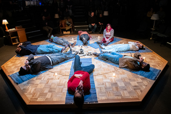 Set designer Debra Booth has configured the flexible Shargai space into a church basement where the group meets; the audience surrounds them from several tiers of seats. As patrons enter, they can stop at a table on the set to pick up the same cookies and coffee or tea as the actors. More directly, just as the eight group members begin the session by locking their cellphones in a box, Studio staff members require audience members to place their own phones in locking packages until after the show ends. Malloy, whose best-known work is Natasha, Pierre & the Great Comet of 1812, takes an opposite tack here. That work, adapted from a section of Tolstoy's "War and Peace," ranges widely among locations with actors who each play numerous roles. Here the characters share their own stories in dialogue and song–and all the singing is a cappella, and rapturous. The members of the group at this particular meeting are Jessica (Chelsea Williams), Henry (Angelo Harrington II), Paula (Tracy Lynn Olivera), Karly (Ana Marcu), Ed (Jimmy Kieffer), Toby (Aidan Joyce), Marvin (David Toshiro Crane), and Velma (Amelia Aguilar). They have all realized that (in 12-step terms) their dependence on tech is controlling their lives and they are looking for ways to free themselves, or at least take one or two small steps away from the screen. Of course, each group member provides a unique perspective. Where one may worry about what he or she might be missing while being offline, others compare their online presence to a physical addiction or fear the possible negative responses of those with whom they interact. Topics include compulsive gaming, the effect of porn on relationships, and–in the case of longtime member Marvin–an epiphany about finding awe in surprising ways. Director David Muse has worked with these actors–especially Crane, Aguilar, and Joyce–so they can manifest the characters' interior attitudes and make them visibly bring them to life on the stage. Ashleigh King, movement coordinator/choreographer, finds ways for the performers to blur the lines that may separate them from the audience, aided by Moyenda Kulemeka's character-revealing costumes and Mary Louise Geiger's shifting lighting design. Octet runs through February 22, 2026, at Studio Theatre, Victor Shargai Theatre, 1501 14th St. NW, Washington DC. For tickets and information, please call 202-332-3300 or visit www.studiotheatre.org. Music, lyrics, book, and vocal arrangements by Dave Malloy Cast: |