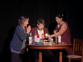 McPherson, known for his way with dark and eerie subject matter (The Weir, Shining City, The Seafarer), wrote The Birds in 2009 for Dublin's Gate Theatre. Like the iconic Alfred Hitchcock film, this play was inspired by a Daphne Du Maurier story originally published in the author's 1952 collection of six stories, "The Apple Tree." Also, like Hitchcock, McPherson veers from Du Maurier's narrative and greatly expands upon it. What all three have in common is a depiction of human society being rendered helpless by all the birds of the world, who wage a sudden and unified attack on all men, women and children, leaving most of their victims dead. The characters we see are trying, against the odds, to survive. Du Maurier's story was set on the coast of Cornwall, while Hitchcock's film takes place on the Pacific coast, north of San Francisco. McPherson sets his play in the near future, somewhere in New England. Though we don't see anything but the front room of an abandoned house in which three people take shelter from the birds' wrath, their descriptions of the vicinity give the sense that it is a rural setting. We can hear surf pounding outside, and we are told that there is a lake nearby. After a good sampling of what the attack of the avians sounds like, the play begins with one of those people, Diane (Kari Elizabeth Godfrey), fiddling with a radio, trying to get a signal to learn what is happening around them. We catch brief snatches of news reports that inform us of the widespread range of the attacks, and ways in which social order is shutting down as a result, but each signal fades, and Diane finally gives up. Nat (Tim Reddy) enters–he had been sleeping for two days, since they fought their way into this house. We don't know how they teamed up, and the two are visibly uncomfortable together, especially Diane–a woman alone in an isolated place with a man she knows nothing about. Nat tries to be reassuring, and first impressions are that he is trustworthy. He makes a fire in a wood stove and she rifles through assorted groceries left by the homeowners, who no doubt fled from the bird attacks or were away and never made it back. The birds squawk and flap their wings against the roof and boarded-up windows, trying to gain entry. Through their halting conversation we learn that Diane is a writer, separated from her husband and was on her way to visit her grown daughter. Nat has no biological children, but feels a bond with his ex-girlfriend's two kids, ages 6 and 8, though he hasn't seen them for 10 months. Nat also reveals that he was locked up in an institution by his ex, who, he claims, severely over-reacted to a difficult time he had been going through. He assures Diane that he is fine now, though she is clearly unsettled by his history. The birds' assaults come in waves, and Nat perceives that the attacks follow the tides. When the tide is out, the birds relent, retreating with the ocean; when the tide comes back in, the birds attack. This gives Nat and Diane a daily reprieve of about six hours in sunlight, granting them time to search for groceries and other necessities. Along with no phone service and no electricity, they have no car, or if they do, there is no gas–it is never broached. We only know that they are constrained by how far they can go on foot and back in six hours. The nearest town is barely close enough to make it there and back, and they are hesitant to take the chance. One day, Diane spots a man (Jon Stentz) outside a house across the lake from them. A neighbor could be helpful, except Diane also sees that he carries a gun. Would he use it against them? Another chance they won't take. Nat and Diane are aware that their provisions are being used up faster than they can be replaced, when a third survivor of the attack comes to their door, desperate for shelter. Julia (Ankita Ashrit), barely an adult, describes some of the horrible things she has seen. She had been hiding with a group of her peers, a treacherous bunch with whom she felt unsafe, so she plotted to slip away. Diane and Nat let her stay–Nat more agreeable than Diane–and she earns her keep by venturing out on junkets and returning with large amounts of food and other goods. Julia is an enigma in terms of her place within their threesome; at times she appears to look to Nat and Diane as parent figures, other times as pals, and sometimes marks Diane as her competitor for Nat's attention. As they say, "the plot thickens," with the dynamics among these three becoming increasingly tangled, with the specter of food running out and a diminishing number of places left to search for more, and the attacks from overhead continue, unrelenting. McPherson is a master of setting up unsettling circumstances with jaw-clenching tension. The tension builds toward intermission, and picks up right where it left off without a lapse in the second act. Joe Hendren's adroit direction keeps the characters on course as they use whatever wits and wiles they have to survive until–until what? That is, perhaps, the most frightening unknown quantity throughout the play. The phenomenal cast present vivid portrayals of their characters. Godfrey captures all of Diane's fears and ticks, her darting eyes trying to stay alert to any possible unseen dangers, as much within the house as from attacking birds. She allows us to see Diane visibly gird her resolve when an act calls for courage. Reddy, as Nat, conveys the spirit of a man who has been beaten down, expecting no more in life than to simply survive. In some ways this may make the predicament less taxing for him, for he is accustomed to living a life under siege. Ashrit gives an engrossing performance, dexterously weaving Julia's three faces–victim, teammate, and seductress–into a survivor's mask. Ashrit, Reddy, and Godfrey bring great authenticity to their characters' interactions, most visibly in an unlikely birthday party scene. Jon Stentz makes a strong impression in his br