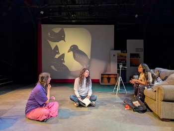 The play also draws on Native imagery and the context of Native life and history, so that it takes on a unique flavor while addressing universal concerns, among them: coming to terms with loss, accepting that flawed family members are still family, challenging the status quo, overcoming denial to face alcoholism (or other addictions), fraudulent purveyors of self-help, and breaking through the ties that bind you to discover your purpose. If that sounds like a lot, well, it is. Razzie has embedded an inordinate number of topics in her play, and the sheer number of things to think about can get in the way of focusing on any one of them. That said, The Nut... provides a plenitude of stimulation, both sensory and intellectual, with text and images that capture our attention. All of the principal characters in the play are Native, and the play is meant to inhabit that universe. Its two central characters are twenty-year old Shadi, who works out of her apartment doing something on a laptop computer, and her younger brother Broder, who lives with her. He moved out of their mother, Mater's, home because her dysfunction proved to be too much for a teenager. Broder is 16 or 17 and very aware that his sister's over-18 status allows her opportunities not open to him. He complains about this on occasion, but won't consider Shadi's suggestion that he can always move back in with their mother. Though he isn't legally old enough, he earns money as an Uber driver. Broder knows that, being underage, he is less than fully formed, and he strives to find the experiences and insights that will help him to be complete. Shadi, barely an adult at age 20, presents an unhappy, lonely persona, and so is also incomplete. Our sense of this is reenforced when a box full of self-help books arrive for her. She doesn't seem particularly engaged in her work, though she diligently plugs away on her laptop. Egged on by Broder, Shadi tries using an online dating app to find someone who may help her to blossom, though it is never clear that this is her greatest need. This episode leads her to discover that the author of one of those self-help books is her own Aunty Ti, the only one of three siblings (along with Shadi's mother and her alcoholic uncle), who has found success in the world, at least as measured by career status. Aunty Ti swoops in with guidance for her niece that sounds good in theory, but reveals a failure to see Shadi as a unique person with unique feelings and concerns. On top of this, Broder and Shadi's cousin Prima shows up in a hysterical state, begging them to let her stay with them and to help her deal with her father's alcoholism, which brings her great shame. Shadi and Broder have hopes of pushing their mother to overcome her lethargy, tidy up her slovenly home, move past her total attachment to her cat, Kitty Garland (in the form of a wonderful puppet, designed by Erica Warren), and face her feelings of loss involving an older bother, whom Broder and Shadi have never known and whose removal from the family is linked to further sources of discord among them. And it appears that Aunty Ti is using the family's private struggles as grist to further her career as a self-help guru. These familial, very human dynamics share space on stage with flights apart from known reality, including a visiting crow, depicted in shadow puppet on screen, and an on-stage one-eyed amorphous being, both of whom pose challenges to Broder. Sound (designed by C. Andrew Mayer) and light (designed by Mike Grogan) contribute a great deal to the effect of these scenes. Mina Kinukawa has designed a spare by effective set enhanced by slide projections. Khamphian Van's costume designs are in synch with each character's nature. Playwright Yazzie co-directs with Amber Ball, keeping the play's disparate elements and tonal shifts swiftly moving. Broder is my favorite character, perhaps because his youth makes him the most ready to face his demons in this world and in the ethereal world of the crow and one-eyed combatant, and also because he has a lively and sharp sense of humor. Nathaniel TwoBears gives a wonderful, spirited performance, adding to the strong impression he made last fall in New Native Theatre's Fallenstar: the Watchoverers. Elena Yazzie conveys the mix of sadness and frustration that hamper Shadi, while also bringing forth her will to pursue change. Charlie Fool Bear gives a sly performance as Mater, etching a depiction of the character's dysfunction early on, but as the play progresses, revealing the source of her pain and the resources she uses to maintain equilibrium. Meredith McCoy gives a winning portrayal of the would-be caring Aunty Ti, drawing on self-help babble while scheming to use the family's turmoil to boost her status in the publishing marketplace. Thomas Draskovic is effective in portraying Uncle, who vacillates between having a good nature and becoming a combatant against his own family under the paranoid haze of alcohol. LaReina LaPlante overdoes her hysterical bit as cousin Prima, making it difficult to really tune in to what is going on with her character. She comes across as a caricature, not a real person. Niizhogaabo is appropriately obnoxious as Broder's recurring Uber customer, demonstrating the vile excess of male ego and misogyny. With so much going on in The Nut, the Hermit, the Crow and the Monk, and shifts in the play's temperament, I can't say with certainty that I grasped every bit of its narrative and messaging. Another viewing might help catch the bits that eluded me the first time. The play runs about an hour and 50 minutes without intermission, and it is hard to attend to so wide an array of input for that long. Perhaps an intermission, allowing time for the audience to process what has already passed, and enabling the narrative to draw in its wings before taking flight in a second act, would be useful. I was never less than fully engrossed, and the themes and intersecting plots in The Nut
