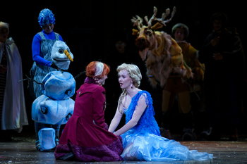 What drew the affection of all those children–and many others of all ages–to this very loose adaptation of Hans Christian Andersen's "The Snow Queen?" For one thing, while there is a romantic subplot, the primary focus is a relationship between siblings, which people of all ages can identify with, as opposed to a romantic relationship, which for kids, resides, if at all, only in the realm of fantasy. For another, it has a few excellent songs by Kristen Anderson-Lopez and Robert Lopez, including the Oscar winning "Let It Go." It also has two delightful comic sidekicks, Sven (a moose) and Olaf (a snowman). All that affection for this story and these characters can now be experienced at Children's Theatre Company, who have mounted an exuberant production of the stage musical based on the film. Frozen is the story of two sisters who are princesses (remember, this is Disney territory) and each other's best friend. However, older sister Elsa has a power that causes anything and anyone she touches to freeze–we are talking hard, killer freeze–and Elsa is unable to control this power. After a close call involving her sister, the two girls are kept apart, and outsiders are barred from the palace. Elsa grows up isolated and fearful of the harm she might inflict, while Anna grows up lonely and hurt by the loss of her sister's companionship. Years pass and Elsa ascends to the throne of the kingdom. The palace is opened to the people for her coronation, but when a mishap allows them to discover Elsa's power, panic ensues. Elsa flees to a castle in the north, intending to live in solitude in order to protect her people. Anna pursues her, certain that together they can find a way to free Elsa of the power that enslaves her. The plot is embellished with not one, but two potential love interests for Anna, and the two sidekicks, Sven and Olaf to deliver comic relief. The end offers an affirmation of the healing power of love that is true. Being the biggest Disney hit in many years, word got out only three months after the film's 2013 release that Frozen would be developed as a Broadway-bound stage musical. They did not offer a timeline for having the show up and on the boards, saying they wanted to take the time necessary to do Frozen right. Their exact words were, "We are not demanding speed, we are demanding excellence." No doubt they sought something as robust as their stage productions of Beauty and the Beast and The Lion King, and not to repeat the recent disappointments of Tarzan and The Little Mermaid. Frozen landed somewhere in between when it opened on Broadway in March 2018 after a tryout engagement in Denver. Even with mixed reviews, the pre-sold title did fairly well at the box office, but not well enough to withstand the high cost of keeping the production afloat when theatre was shut down in March 2020 by COVID, ending with a two-year long run, respectable but far from a Disney juggernaut. Since then, the national tour production came to the Twin Cities, but I missed it. Mounting their own production of Frozen is a tremendously ambitious choice for Children's Theatre Company. The show calls for a large cast, elaborate sets and costumes, special effects, and lead performers with dramatic depth and terrific voices to deliver the movie's well-known songs along with eleven new songs by Anderson-Lopez and Lopez, making a total of nineteen musical numbers, plus reprises. While no longer the latest big news in family entertainment, Frozen has taken its place among other Disney "classics," so it is well known by today's children who will arrive with high expectations of seeing, not necessarily a replica, but a reasonable facsimile of a beloved movie. Since I have not seen any other productions of the stage musical, I cannot say how this Frozen stacks up against the Broadway version, but I can say that Children's Theatre Company has achieved a great success with Frozen. The performances are brimming with life, the staging by director Tiffany Nichole Greene is a continually fluid piece of storytelling, embedded with lively dance numbers by choreographer Rush Benson. Elaborate costume designs by Ari Fulton, Scott Davis's gorgeous sets, complete with Nordic rosemaling, Driscoll Otto's superb lighting design, and Michael Salvatore Commendatore's projection designs, which create illusions of blizzards and northern lights, provide a feast for the eyes. As music director, Denise Prosek has the ensemble's voices rise in glorious choral harmonies, and she conducts a snappy eight-member orchestra that brings luster to the score. It should be noted that, as is often the case when a movie musical is beefed up with additional songs for a stage production, many of the newcomers to the score are notably of lesser rank. Of those eleven new songs, I would rate only three as up to the standard of the originals: "A Little Bit of You," "Dangerous to Dream," and especially "Monster," which provides Elsa with a stirring musical epiphany. "Hygge," is not a particularly good song, but it provides the occasion for what is the show's most elaborate dance production number, infusing a burst of energy into the top of the second act. The show is extremely well cast, with Gillian Jackson Han as Elsa, and Julia Ennen as Anna, each honing in on the uniqueness of their characters: Elsa, more inwardly focused, fearful of engagement with the world; Anna, the extrovert and optimist, eager to embrace life. Both actors have lovely voices that do justice to their songs. The roles of the young princesses are double cast. At the performance I attended, Reese Sweeney, as young Elsa, and Molly Toutant, as young Anna, were charming, self-assured, and delivered two songs, "Do You Want to Build a Snowman?" and "A Little Bit You," with flair. Matthew Hall makes a strong impression as Kristoff, winning the audience over with a wide range of emotions, from the comical "Reindeer(s) Are Better Than People" to the tender "Kristoff Lullaby." Dyl