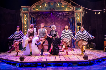 In Whoa, Nellie!, the musical with book, lyrics and music by Josef Evans closing out the 2024-2025 season at History Theatre, you will learn all this and more–though some of what you will see on stage are Evans' inventions, intended to illustrate examples of the kind of life adventures Nellie King accumulated in her wild ride of a life. In fact, there is little written about her, other than the newspaper archives that no doubt provided Evans with a lot of his material for the show. Nellie's frequent run-ins with the law left a trail of news clippings. She is said to have carried these with her, sometimes using them to impress would-be captors into letting her go. Nellie King was part of a string of American criminals who somehow captured the public's imagination and became folk heroes, the likes of Billy the Kid, the James Gang, Ma Barker, and Bonnie and Clyde. Although they caused a great deal of heartache and loss for their victims, the public at large–egged on by newswriters eager to sell papers–often viewed these characters with wide-eyed fascination. Whether Nellie drew this kind of attention or not, it appears to have been her ambition. Whoa Nellie! offers the conceit that Nellie sought attention not just for being an outlaw, but for flaunting conventions of appropriate behavior and appearances as a woman. Early in the show we are introduced to celebrities from her era who defied boundaries around sex or race. These include fabled sharp-shooter Annie Oakley and investigative reporter Nellie Bly, who both achieved fame doing work that was rigidly ascribed to men. Bert Williams was one of the most successful entertainers in his day, breaking barriers for other Black performers. Aida Walker was another enormously successful Black vaudeville and theatre star, often performing with her husband George Walker; after George's death, she achieved acclaim for performing the male roles with which he had been associated. Julian Eltinge was a famed female impersonator in vaudeville, theatre, and silent films, though off-stage he presented strictly as a straight male and took great issue with anyone who suggested otherwise. Evans has devised a series of vaudeville acts that highlight these breakthrough personalities and the rigid parameters they fought against, not as part of Nellie's narrative, but laying out the landscape on which she journeyed. This is particularly true in the first act when five songs in succession leave Nellie's tale on the sidelines. The first of those, "Boom Town," doesn't even approach Nellie's story, as it deals with competition between Minneapolis and St. Paul over which burgeoning city was most "booming." Another of those songs, "Hysterical Damsels," is exceedingly hard to listen to as four male characters disparage female emotionalism in obnoxious terms. The song is immediately followed by "You Gotta Be Crazy (Not to Go Crazy)," which gives three female characters the chance to fire back, and their shots score a round of bullseyes. None of this is really about Nellie, though she lived in that world. We learn about Nellie from the narrative scenes, with several songs integrated into those scenes adding depth to her story. We also receive updates on her escapades through journalist Nellie Bly reading breaking news stories about Nellie, a somewhat tired, but in this case, effective device. It is unlikely that Nellie King had any actual dealings with any of those more famous people, but their appearance in Whoa, Nellie! sets up a celebration of her bravado and ingenuity in flaunting convention, putting her in the company of those who did so without breaking the law. Unlike those others, we can't quite approve of Nellie because of her crimes and moral weakness, but we definitely can enjoy her company and sympathize with her struggle to free herself form society's boxes, especially in the remarkable performance by Em Adam Rosenberg in the title role. Rosenberg has been seen on many stages in the Twin Cities over the past several years in a wide range of roles, from Shakespeare at the Guthrie to Rent at Artistry, but has not till Whoa, Nellie! held the center of a musical. I can say without hesitation that they can not only hold the center, but also spin it on the tip of their finger should they choose to. Rosenberg has a full, evocative voice with a wide range (kd lang comes to mind) and emits a charisma that never wanes. Good thing, too. Nellie King might, in the wrong hands, be a hard character to want to spend this much time with, but Rosenberg wins us over. The rest of the top-notch cast play multiple ensemble parts in addition to a primary role. Bert Williams acts as the de facto emcee, and John Jamison II is terrific in that role, showing us through acting, singing and dancing the kind of show-biz panache that explains Williams's huge success. Tod Peterson is the funniest person on stage as over-the-top vaudevillian John Durham, while Jay Owen Eisenberg's portrayal of Julian Eltinge delivers a winning blend of dignity and sass. Erin Nicole Farsté brings a beautiful voice to her performance as Aida Walker, Therese Walth portrays Nellie Bly with a gust of newsroom brio, and Leslie Vincent conveys Annie Oakley's cock-sure confidence. Thomas Bevan has a dashing leading man quality (and a fine voice) as actor Edward Loudon, as well as one of Nellie's several husbands who saw her through a particularly rough time. Director Laura Leffler does a good job of balancing the vaudeville numbers with the more standard musical theatre book scenes, making effortless transitions between the two. She keeps the overall atmosphere of the show light, then nimbly transitions into more somber territory when the dark side of Nellie's past life finally closes in. Joey Miller's sprightly choreography brings added entertainment value to the production, and music director Amanda Weiss leads a four-member band that delivers Evans' score with flair. Joel Sass' cleverly conceived set design