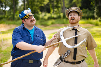 This year's edition, the company's 17th, is a remount of one of the first productions in the series, The Return of King Idomeneo, based loosely on Mozart's opera Idomeneo re di Creta (Idomeneo, King of Crete), which premiered in 1781. Mixed Precipitation's rendition was first staged in 2012. I didn't see it that first time, but having attended the current production, I can easily see why it was a hit in 2012 and why it was a good bet to bring back for a second run. In fact, of the ten Mixed Precipitation Pickup Operettas (and their predecessors, the Picnic Operettas) that I've seen, The Return of King Idomeneo ranks up near the top. Mixed Precipitation's twist on these operas is to take the original story and update it to a contemporary (or near contemporary) time, inserting pop culture references and topical events, all with a satiric, somewhat outlandish eye. As for the score, a handful of pop tunes are dropped into the narrative, while a generous supply of highlights from the original opera are maintained. In this case, the composer is Mozart, sung in the original Italian. The libretto by Giambattista Varesco is reduced to pithy sentences and revealed in translation to the audience in a raft of clever ways. One marvelous example: in a scene that calls for much tear-shedding, the principals pull sheets out of a Kleenex box which unfold to reveal the gist (as adapted by Scotty Reynolds, Paul Coate, and Marya Hart) of what the lyrics are meant to convey. This kind of cleverness is part of what makes these Pickup Operettas such a joy. If you are a fan of bona fide opera, you will be rewarded by the rich voices of the cast members, especially the principals. Their accompaniment is an unlikely pairing for opera, a rag-tag combo that is part string quartet and part country band led by musical director Gary Ruschman. The blend of accordion, guitar, violin, cello, and a sprinkling of percussive instruments sounds right for both genres. The pop songs, in this case, draw from do-wop vocal group sounds of the 1950s, leading off with the rockabilly "Hot Rod Lincoln" by Charlie Ryan–the words altered to suit the plot–and winding up with Bobby Ray's 1957 "Little Bitty Pretty One" for the finale. The plot, taken from Greek mythology, is set at the end of the Trojan War. Following their victory over Troy, the heroes of Crete return to their homeland, but King Idomeneo is not among them, being still out at sea. The returning Cretins have brought Hecuba, the Trojan Queen, and her daughters as prisoners. King Idomeneo's son, Prince Idamante, and Ilia, one of Hecuba's daughters, fall in love in a flash, but the enmity between Crete and Troy would keep them apart. The two besotted youths implore all sides to renounce their differences and live in peace. When Idomeneo faces death from the wrath of a massive oceanic storm, Neptune, god of the sea, makes a bargain to spare the King's life in exchange for his vow to kill the first living creature he spies upon reaching land. Idomeneo's gratitude for Neptune's intercession is short-lived when the first creature he sees is Idamante, his son. Trying to forestall the inevitable, the King plots for Idamante to escort Electra, a woman exiled from Argos, back to her home, and while the Prince is gone, chose a different victim to sacrifice. This suits Electra, who is jealous of Idamante's attention to Ilia and plans to lure him away and claim his heart for herself. But before Idamante and Electra set sail, the ocean erupts in turmoil caused by a sea monster, the result of polluted sludge being pumped out from the city. Now it is Idamante's turn to be heroic and do battle against the sludge monster. Will he succeed? Will he be spared the fate set by his father's vow to Neptune? Will there be a happy ending for Idamante and Ilia, or will Electra tear the lovers apart? The original opera is classified as "opera seria," meaning serious in style and narrative. Then again, this is no longer the original, but the love child of the Mixed Precipitation team's fling with Mozart. Paul Coate's staging keeps the action moving steadily and, to the degree possible given the convulsions of the plot, maintains a clear account of the narrative. Performers often quickly swap out Rhiannon Fiskradatz's wittily conceived costumes to take different parts, and all is achieved quite smoothly. Antonia Perez's choreography further enlivens the show, contributing to the festive feeling of the entire affair. The cast are all aces. Phil Takemura Sears performed as King Idomeneo for the last time at the performance we attended, with Roland Hawkins stepping in for the duration of the show's run. Sears delivered his vocals with a lush and powerful baritone, and ably enacts a king restoring his authority after a long absence, as well as the torment of being trapped by his own vow of having to slay the person most dear to him. Joni Griffith, a mainstay of the Pickup Operettas, is marvelous as youthful Prince Idamante, singing beautifully and bringing a conviction to his romantic entreaties, and a staunch convictions to his determination in all endeavors–all with a twinkle of playfulness about him. The role, written to be performed by a male castrato in Mozart's day, is now meant to be performed by a tenor, but Griffith's range suits the role nicely. Kaoru Shoji is completely winning as Ilea, the ingenue of the piece. Her soprano voice is beautiful, bringing luster to the moving aria "Padre, germani addia" and paired with Griffith's Idamante. Shoji conveys Ilea's spunk and idealism, though, given the outdoor venue (with a notable wind), one wishes she could attain a higher volume. Jill Suzanne Morgan performed as Electra (she alternates in performance with Alexis Reed) with a strong voice that shows the character's headstrong resolve, especially letting loose in "Since I Don't Have You," a 1958 hit by the Skyliners. The remaining cast members are all swell in smaller roles, with special notice to 