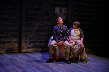 Given the lackluster response, the show was never sent forth as a national tour, yet Big Fish pops up repeatedly at regional and community theaters. Its narrative, built around a between a father and son relationship and laced with fantastical tall tales that lend the show colorful settings, quirky characters, and whimsical plot twists, has an undeniable appeal. Moreover, it has a good heart and in a time when cynicism runs rampant both in daily life and in our entertainments, a good heart counts for a lot. If the Big Fish is not a top-drawer musical theatre work–which it is not–it still offers the chance, in capable hands, for an audience to be entertained and a bit moved. Those capable hands, in this case, are the team at Lyric Arts Main Street Stage in Anoka, who have been on a roll, mounting one winning production after another. In this case, director Scott Ford draws out all that is intriguing and decent about the story, while delivering it with strong entertainment values. The production is well-sung, well-acted, and well-danced by a strong cast, led by a stellar Ben Bakken. Choreographer Hannah Weinberg-Goerger has devised imaginative dance routines that astutely embellish the basic storytelling function of this show, making inventive use of the relatively small (for musical theatre) stage to mount robust numbers that never feel small. Bakken, in the lead role of Edward Bloom, inveterate spinner of yarns, has a chance to show us his dancing chops, in particular in a lively display of step-dancing early on. Edward hides the truth about his life behind a cavalcade of preposterous–though amusing–stories in which he cavorts with a mermaid, works at a circus, befriends a giant, alters the course of the Korean War, and has the nature of his final demise foretold to him by a witch. Bakken ably expresses Edward's quixotic philosophy in the opening "Be the Hero," and delivers the sweetness of the spark of true love in "Time Stops," shared with Kate Beahen as Edward's wife Sandra. He easily holds the center stage among the crowd in several lively production numbers throughout the show, and on a final number that manages to turn heartbreak into joy. Beahen establishes her own strong presence as the middle-aged Sandra buffeted by the discord between her husband and their son, Will, lovingly expressed in "Two Men in My Life," while affirming the happiness life has given her in "I Don't Need a Roof." As the ingenue, Sandra, pursued by love-struck Edward, Beahen shares the romantic "Time Stops" and his impassioned pursuit of her affection among a sea of "Daffodils," with him. Will, grown and about to get married, wants his father to stop telling outrageous lies and reveal the truth about himself. Adult Will is played by Will Gaspar, who shows himself to be a promising recent arrival to Twin Cities stages. Gasper earnestly conveys Will's growing anger toward a father who remains a "Stranger" to him. Young Will was played by Jonah Dale Matias Anderson at the performance I saw (alternating with Kaden Hesser). Anderson proved to be a winning performer, persuasively showing the confused emotions of a boy who wants to believe his father's tales but is already too wise to be fooled. Anderson sings with a strong, show-worthy voice and especially shines in Young Will's duet with Edward, "Fight the Dragons." Among the other notable roles, Justin Betancourt is terrific as the ringmaster who takes Edward into the circus, drawing a favorable comparison to Danny Devito, who played the role in the movie. Brandon Osero is wonderful as Karl the Giant, another featured player in the tall tales Edward has told Will over the years. Megan Beard gives a winning portrayal of the hometown sweetheart Edward leaves behind, and Lydia Rose Prior is lovely as Josephine, Will's insightful bride. Curtis Phillips' simple but effective set design is greatly amplified by projections designed by Brady Whitcomb that create backdrops for all of Edward's farfetched tales. Samantha Fromm Haddow has designed costumes that help to affirm each character's part within the story, while Shannon Elliott's lighting design offers shifting tones and focal points from scene to scene. The story is set in Alabama, and Gillian Constable has worked with the cast as dialect coach to draw out apt, but not overdone, Southern accents. The score is well played by a 12-member band, conducted offstage by Wesley Frye. While Lyric Arts has done everything right, from casting to design to staging, Big Fish remains an enjoyable but not outstanding musical. The songs, with music and lyrics by Andrew Lippa, serve the narrative well, especially those mentioned above, and the big numbers feel like they erupt organically out of the plot, rather than being shoe-horned in. Yet, the songs are not particularly memorable and none stand out as defining elements of the show. John August's book, drawn from his own screenplay, necessarily tightens things up in the plot, giving the show a more episodic quality, rather than offering a coherent through-narrative. For example, August combined two elements from early in the plot, Edward's hometown of Ashton and the spectral village he discovers while out on the road, into one, which streamlines the pace of the show but undermines the magical elements of its conclusion. While these observations certainly do not ruin Big Fish, they explain perhaps why it falls short of greatness. Nonetheless, it is a vibrant musical with characters that charm, a story that keeps its audience engaged, and a bit of armchair wisdom to offer. Lyric Arts has taken these positive attributes and twisted and polished them into a marvelous entertainment. Like its title, Big Fish is one you want to catch. Big Fish runs through October 5, 2025, at Lyric Arts Main Street Stage, 420 East Main Street, Anoka MN. For information and tickets, please call 763-422-1838 or visit lyricarts.org. Book: John August; Music and Lyrics: Andrew Lippa, based on the n