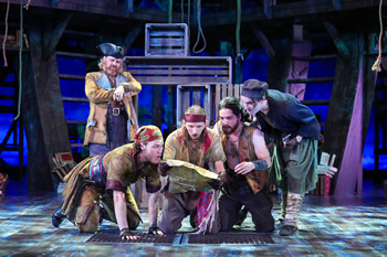 The only Treasure Island to ever appear on Broadway was a 1915 adaptation by Jules Eckert Goodman that was a success at the Punch and Judy Theatre and was revived in 1938, one of the last shows to play the legendary Hippodrome before it was demolished. Other adaptations have set sail, including recent attempts by Mary Zimmerman and Ken Ludwig, but none that drew fire in a big way. The musical Pieces of Eight, a late-career effort by Jule Styne, with book by Michael Stewart and Mark Bramble, directed by Joe Layton and starring George Hearn, straight from his Tony-winning turn as Albin in La Cages aux Folles had sights set for the Broadway, but after a 1985 tryout in Edmonton, Canada, the vessel proved unseaworthy and sank, never to be seen again. Children's Theatre Company is presenting a version adapted for the stage by Stuart Paterson. The story is told mainly through the eyes of Jim Hawkins, a good-hearted and stalwart young boy who works at a coastal tavern run by his mother. Their patrons include seafaring types, many of whom have unsavory manners and dangerous pasts. One of the regulars, Billy Bones, is set upon by his enemies, and as a reward for Jim's kindness, bequeaths to him a map of an island bearing an X to mark the location of buried treasure. Learning this, two solid citizens, Squire Trelawney and Doctor Livesey, seize the momentum to raise a ship and retrieve the treasure, enlisting Jim as their cabin-boy. Trelawney hires an effusive, one-legged cook named Long John Silver, who recruits the rest of the crew, fine sailors with whom he has shared duties of ocean voyages. Long John takes Jim under his wing, claiming to be as fond of the boy as if he were his own son. Captain Smollett, the ship's commander, is uneasy with the crew, but as Trelawney is financing the voyage, the Captain holds little sway. Over the course of the journey, individuals reveal their true colors, which unspools into all-out rebellion once they reach the island. Jim must make choices about morality and integrity, placing himself on a path toward mature adulthood. Paterson's adaptation streamlines the original plot a bit without losing any of its narrative currents. It marks the first directorial outing by Children's Theatre Company's new artistic director, Rick Dildine, who has taken the helm after Peter C. Brosius' long and accomplished tenure. Dildine ably sets a tone of apprehension and high adventure, while keeping the narrative flow moving steadily over the course of a long (by Children's Theatre standards) runtime of two and a quarter hours, with a 15-minute intermission. Dildine makes great use of ingenious sets co-designed by Christopher Swader and Justin Swader, with transitory pieces–barrels, wooden crates, and boards–creating settings within the framework of a deep ship's hull, all encased in a library full of books, suggesting multiple layers of imagination. Blake Mann's atmospheric projections provide a constant swirl of foaming waves and drifting clouds. While not a musical, the play makes wonderful use of music, subtly integrated throughout the show under music director Victor Zupanc's steady hand and piano playing. Several actors take up guitar, violin, drums, and vocals in various combinations on stage. This frees up the orchestra pit to serve as the ocean through which their ship makes its way, offering some clever and impactful staging opportunities abetted by Melanie Chen Cole's splendid sound design. Jeff Behm's lighting design adds marvelously to the vivid atmosphere, whether it's a rough and tumble tavern, on the high seas, or a thickly forested deserted island. Alexa Behm's costumes conjure up every vision of 18th century landed gentry, rough-living sailors, and bona fide pirates stowed in our imaginations. The entire acting ensemble is wonderful, without a false note. Leading the pack are Truman Bednar (alternating with Mason Yang) as Jim Hawkins and Reed Sigmund as Long John Silver, the character that created the stereotype of a peg-leg pirate with an insolent parrot on his shoulder. Bednar gives a full-bodied performance. His Jim is totally ingratiating as the story's young hero, demonstrating at different turns grit, kindness, courage, judgement, and exuberance, a combination that makes him a positive role model for any young boys in the audience. Sigmund has had enough go-rounds as the Grinch to easily take on the mantel of a villain. In this case, as Long John Silver, he is a more deceptive and perhaps conflicted villain, leading us to question whether Long John really has a fondness for Jim, or is merely using the boy to attain his own ends. Other standouts include Matt Riehle, both as the dissipated Billy Bones and the skeptical Captain Smollett; Ryan London Levin, who usually excels at playing likable types, just as convincing as two particularly sinister characters, Black Dog and Israel Hands; José Sabillón as the castaway Ben Gunn, a truly original character if there ever was one; and Em Adam Rosenberg as Squire Trelawney, who allows his sense of entitlement to blind him to the risks he blithely take on. Rosenberg also adds their particularly lustrous voice to a couple of the musical moments. A word of caution about Treasure island. Children's Theatre rates the show as suitable for ages 8 and up, and while I saw many younger children in the audience, I would take that caution to heart. The story includes a number of murders, including gunfire, as tends to happen among pirates, and other frightening moments. My friends who accompanied me–an 8th grader and a 9th grader–expressed concern for the nightmares those young, traumatized children had in store. This is a fantastic production of a rip-roaring story, a grand way to open a season and for Dildine to launch his term as artistic director. If there hasn't been a nationally recognized stand-out stage version of Treasure Island, I could easily see this one raising its Jolly Roger and setting sail to berth at th