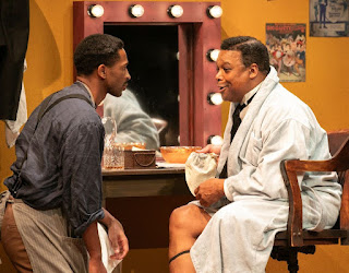 Bert Williams began his life as an entertainer with performing in minstrel shows as a teenager in the 1890s. This was a new twist on minstrel shows, having actual Black men perform along with the tradition of white men in blackface. Over the course of thirty years, Williams became one of America's biggest stars. In vaudeville, he hit the heights with long-time performing partner George Walker. Williams and Walker appeared in successful stage musicals, including In Dahomey, which in 1903 became the first show written, directed, and performed by Black artists to play on Broadway, followed by a successful run in London, including a command performance at Buckingham Palace. After Walker suffered a stroke in 1910, Williams continued on his own, returning to vaudeville and becoming the first Black performer to appear in the Ziegfeld Follies, starting with the 1910 edition (the one in which Fanny Brice also first appeared) and in four more editions through 1919. He was also a top-selling recording artist and appeared in several silent film comedies. Brown opens the play as Williams nears the end of his career in 1923. Williams' dresser, called Chappy (Derrick Moore), is singing his own rendition of "Nobody" in the dressing room while waiting for his boss to return from the stage. Williams (Shawn Hamilton) enters in an outlandish chicken costume, interrupting Chappy's performance and irate to have his song usurped by his employee. However, we soon observe that Chappy, who has been with Williams some 20 years, is more than an employee–he is Williams' confidante, nursemaid, and friend. Williams' admits that his anger is as much at the song itself as at Chappy. "Nobody" contributed massively to his celebrity and wealth, but the insistence of audiences that he include it in every performance wears at him. The song's downbeat, cynical message must have been demoralizing, day after day. Williams is a dispirited man, subject to rumination about bygone pleasures, second-guessing chances he didn't take, and bitter about vile racism that dogged him despite his fame. He marinates all of those feelings with lots of alcohol, which Chappy discourages to no avail. The term Chappy uses to describe his boss is "maudlin." Chappy helps Williams' out of his costume–the chicken suit being so outrageous, the fact that he wears it to show himself to the public only adds to the maudlin affect. From here, the show consists of Williams and Chappy reminiscing about Bert Wlliams' career, with flashback scenes that introduce us to the dapper George Walker (Dennis W. Spears) as well as Walker's wife Aida Overton Walker (Regina Maria Williams), and Williams' wife Lottie Williams (Monica E. Scott). Both women performed with their husbands, as well as having their own careers. We also meet Florenz Ziegfeld, persuading Williams to accept the challenge of appearing in the Follies, and David Belasco (John Middleton in both roles), the legendary playwright, director, and producer, who tries to persuade Williams to abandon his sad clown persona and do a serious play. Playwright Brown, who also directs the production, has Williams remain sans pants, in his boxer shorts, for the duration, including the flashback scenes, as if we are seeing the man unclothed. The highlights of Nowhere, No Time are the musical numbers, performed with brio and style, and especially shining when the suave Mr. Spears or silky Ms. Williams are on stage. When Spears and Hamilton dish out snappy repartee in "I Don't Like That Face You Wear," you can see how Williams and Walkers' act gained a big following, though material that might have been bold, cutting, and suggestive in the 1890s, feels charming and light-hearted by today's standards. "Play that Barbershop Chord," late in the show, gives Moore, joined by Hamilton, a chance to display tap dancing finesse, with choreography by Hank Smith. The piano accompaniment by music director Justin D. Cook and percussion by Trenon Graham serve the primarily minstrelsy and ragtime melodies well. When we finally here Williams deliver his signature "Nobody," Hamilton hits straight to the heart, conveying the despair and resignation that solidified Williams' persona as a clown weighed down by heartache. The simple refrain spells it out: "I ain't never done nothin' to Nobody. I ain't never got nothin' from Nobody, no time. And, until I get somethin' from somebody sometime, I don't intend to do nothin' for Nobody, no time." The primary disappointment with Nobody, No Time is that, while its subject's life is fascinating and worthy of dramatization, and his legacy is of indisputable importance, the play comes most fully to life only during those musical moments. The conversations between Williams and Chappy repeat themes of the great star's descent from the heights, his heavy drinking and faltering health, his bouts with institutionalized racism, and his fear of venturing beyond the safety of playing a sad sack with his face covered in burnt-cork blackface, to make a burlesque of his racial identity. All this is very quickly revealed, leaving the play short of momentum. In no way are the actors at fault, for they all do excellent work, with Hamilton's Bert Williams and Moore's Chappy completely winning. They flesh out their respective characters and convey the depth of a friendship, masked by difference in status, that developed between these two men. Chappy may or may not be an invention of the playwright. I have been unable to find any evidence that he existed, but if he is an invention, both the playwright and the actor have made him totally plausible, and in the context of this play, essential. Joseph Stanley designed a beautiful set that manages to fit convincingly realistic replicas of Williams' backstage dressing room and the raised proscenium performance stage on which the flashback scenes are played, with the musicians in view on the side. Zamora S.' costume designs are historically apt and are lovely–that is, 