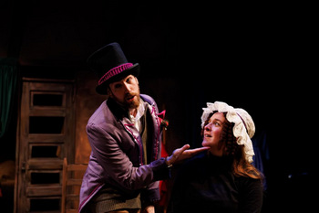 A Christmas Carol...More or Less, written by husband and wife Stefano Loverso and Mary Irey, is in a subset of the sub-genre, where the complex totality of A Christmas Carol is performed by a woefully insufficient number of actors. In Scrooge in Rouge, currently at Open Eye Theatre for its third successive holiday run, the entire story is staged by a cast of three, with the added fun of a bawdy English musical hall setting. A Christmas Carol...More or Less does that one better by playing the entire tale with two actors. The added novelty here is that the two performers are a husband and wife forced into taking on this challenge while their marriage is on the brink of ruin. Charlie (Paul LaNave) and Sarah (Kate Beahen) have been running a small theatre company in a remote mountain community. Sarah, the director, is committed to making a go of it, but Charlie, a writer, is fed up with scraping by on the meager income it provides them and their four-year-old son. Charlie is about to fly off to Los Angeles where he has work as a writer for a TV series, though when the name of the series is revealed, it hardly seems like a plum gig. Still, he is confident there will be other opportunities and the chance to make the connections needed to get his own plays produced. It is clear that his leaving is not a couple deciding on a long-distance marriage in order to advance both of their careers, but a tipping point that threatens to end their relationship. Then a blizzard causes Charlie's flight to be cancelled. Worse than that, for Sarah, the entire cast and crew were on a skiing excursion and are now stranded, unable to get back for the sold-out show. Sarah can't afford to cancel and return the audience's money. How to honor the old mantra "The show must go on"? She convinces (blackmails might be more apt) Charlie to perform in the play, which he knows practically by heart, with her. He will be Scrooge and she will be everyone else–and also take care of the sound and light cues and set changes. The result is a delightful affair as the two pull off the impossible, with Sarah racing about to switch off hats, wigs, aprons, coats, and whatever else is needed to take on a multitude of roles, while Charlie changes off in the scenes where Scrooge travels with the Ghost of Christmas Past and must play both the younger Scrooge and the older Scrooge, observing his past. Being that they are working from what is meant to be happening in each scene, a familiarity with A Christmas Carol is probably a prerequisite for getting the most out of the play. Fortunately, most theatregoers will have met this requirement. The result feels like a series of comedy sketches, barreling one after the other as the story of Ebenezer Scrooge's transformation from miser to benefactor plays out. This isn't terribly surprising, given that the playwrights cut their teeth as writers for "Saturday Night Live." Some of the sketches, or scenes, are funnier than others, but all of them are entertaining. The cleverness with which up to eight characters are on stage at once, played by only two actors, is quite amazing. The best of these had the audience roaring with laughter. Among my favorites is a scene early on when two charity solicitors are seeking Christmas donations for the needy. Sarah wears one top hat and holds another in her hand to represent the second solicitor, swapping them back and forth as each speaks. The two hats relate to one another as if human beings were beneath both of them. Another highlight is the Christmas dance at Old Fezziwig's, where Scrooge worked as a youth. It is quite a remarkable thing for two actors to create the illusion of an overheated warehouse packed with exuberant celebrants. Then there is the Cratchit family Christmas dinner, with the Cratchit children represented by garments on coat hangers. In the process of putting on the play, Charlie begins to see some of himself in Ebenezer Scrooge, with his plan to fly off to the coast to seek wealth. He sees his impending separation from his son in parallel to the Cratchit's separation from the sweet boy called Tiny Tim. What the play loses in terms of total faithfulness to A Christmas Carol–the "Less" in the title–it gains in depicting a couple overcoming a marital crisis, which is the "More" in the title. The fast-paced change of character, handling of props and costume elements, and running off stage to switch the lights or turn on a sound cue fall heavily on Beahen, and she handles it all majestically, manipulating her wide range of characters as if she were three or four people, not one. LaNave is excellent as well, initially smug, even hostile, as Charlie is about to fly the coop. Gradually, he recognizes his faults and seeks ways to change the outcome, just as Scrooge does on that fateful Christmas Eve. Beahen and LaNave have good chemistry together, whether sparring or melting into each other's arms. Director Markell Kiefer has her hands full keeping this twosome on track, synchronized with numerous sound and light cues, costume switches, and set changes, making it all look seamless. She keeps the tone playful throughout, even when the elements addressing Sarah and Charlie's marriage are in view. K. Mielke has created ingenious costumes in light of the fact that aside from Charlie and Sarahs opening scene street clothes, the costumes take the form of minimal suggestions of a costume, yet each is enough to establish a character. Erica Zaffaranos set works well to efficiently allow set pieces to be switched on and off stage. Sarah Bradner's lighting design and Matthew Villach's sound design contribute greatly to creating the essence of each scene. I>A Christmas Carol...More or Less has been circulating around the country at regional theatre companies and colleges for over two decades, but as far as my search could reveal, this is its first staging in the Twin Cities. For anyone seeking a seasonal entertainment that draws on traditional holiday fa