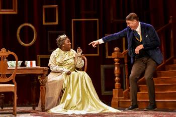 The Jungle scheduled Dinner for One again for this holiday season, no doubt drawing repeat fans enamored with the show, as I was, along with new audience members. This time it is being performed by two different casts in rotation: Lichtscheidl, returning as James, co-stars with Baldwin as Miss Sophie at half the performances; Joy Dolo and Tyson Forbes, who understudied those two roles last year, appear at the other half of the performances. I was intrigued to see how the play would work with actors who hadn't been involved in its creation and chose to attend a performance featuring Dolo and Tyson. Happily, though not surprisingly, Dinner for One continues to be an enchantment in new hands, though Dolo and Tyson bring different qualities to their portrayals of the once vibrant Miss Sophie, now aged and sparkling only in her memories, and her doggedly faithful butler, James. Dinner for One is based upon a twelve-minute-long comedy sketch written in the 1920s by English actor-writer Lauri Wylie and first performed in 1934 as part of a revue compiled by Wylie. It popped up on Broadway in 1953 as part of John Murray Anderson's Almanac but faded into obscurity in both England and the United States. However, in 1962 it resurfaced in Germany in an eighteen-minute-long version broadcast on German television. That broadcast became an annual New Year's Eve tradition, spreading to Sweden, Finland, Norway, Denmark, Austria, Switzerland, Belgium, Luxemburg, South Africa, and Australia. The piece has been broadcast specifically on New Year's Eve because it is set on a New Year's Eve, which also happens to be the occasion of Miss Sophie's birthday–in some productions her 80th, in others her 90th. In the expanded play at the Jungle, we begin twenty some years earlier, with a series of brief scenes that set the stage for the core of show. The first brief scene reveals Eli Sherlock's atmospheric set. It is a gracious but defeated-looking dining room, with the dining table covered by a large cloth as if to deter any thought of indulgence. An old-fashioned gramophone with a large amplifying horn plays music recorded on wax cylinders, the antecedent of records. At the rear of the room, an abundance of frames hang salon style, with the pictures within them removed, as if this room is bereft of the life it once held. One of the frames is far larger than the others, with drapes covering whatever image it contains. James prepares a pair of glasses for a celebratory toast. Miss Sophie descends haltingly down an elegant staircase, covered in black mourning garb. She eyes the glass James extends to her, waves it away, and returns upstairs. After a brief blackout, it is the next year. This is repeated over the course of several years, as James tries to dispel Miss Sophie's melancholy with a new gambit each year, and Miss Sophie's staunch resistance cracks just a little more each time. After several such episodes, we leap ahead twenty years. The covering is off the dining table, which is set for a formal dinner. Miss Sophie descends down the stairs rid of her black mourning clothes, now dressed in a golden gown and coat fit for a queen, with matching gold shoes, gloves, headpiece, and a lengthy train that requires James' assistance to negotiate the space (Ora Jewell-Busche designed the splendid costumes). James claps his hands toward the large, draped frame, and it reveals a pianist and violinist who provide music–mostly in a classical vein–to accompany the evening. The table is set for Miss Sophie and four gentlemen guests. These are the great admirers and lovers of Miss Sophie's past: Sir Toby, a renowned actor and a sot; Admiral Von Schneider, whose adventures were on the high seas; Mr. Pomeroy, who mumbles indecipherably but makes his deep affection for Sophie known; and Mr. Winterbottom, a poet dripping with flowery verse and a hint of lechery. However, none of these four are actually present, as Sophie has outlived them all. James dutifully impersonates each one in turn, as they express their regard for their hostess, present her with gifts, and make romantic toasts in her honor. Sophie adores them all. She also imagines the presence of her cat, Whiskers, admonishing him from time to time, which prompts James to earnestly meow. In the course of the dinner, each guest has an opportunity to retrieve a treasured memory and reenact it with their beloved Sophie, with the obliging James taking each part. Every course of the dinner calls for a toast, with each gentleman chiming in. James, ever-obliging, consumes four glasses of liquor in every round and becomes increasingly soused. Miss Sophie pays no heed to this, but his slapstick movements and sloppy speech gets a great rise from the audience. The play takes a serious when Sophie opens the gift James has left, drawing them both to the here and now in a perfectly bittersweet and lovely ending. James is the showier role, given that the actor is called on not only to play the loyal butler, whose feelings toward his employee are open to speculation, but also create vivid sketches of the four imaginary dinner guests–and a cat to boot! Tyson Forbes is up to the demands of the role, which calls for superb physical comedy as well as distinctive characterizations. As a man becoming increasingly drunk, his speech and behavior increasingly sloppy, he draws hearty laughs and manages to avoid making this depiction offensive. Similarly, a running gag about tripping on a bump in the rug is the kind of bit that can easily become wearisome, but not here: Tyson make each incident a fresh occurrence of that familiar stumble and it only becomes funnier. As Miss Sophie, Joy Dolo must convey an initial melancholy, followed by gaiety and coquettishness dependent on being committed to the fantasy she has created, and, finally, as she is brought back to reality, glide into a state of contentment, if not elation, before the night is through. There must be the emergence of an unexpect