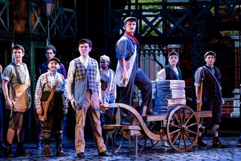 The plot follows Jack Kelly, the charismatic leader of a ragtag group of newspaper sellers in 1899 New York City. When powerful publisher Joseph Pulitzer and his fellow publishers raise the price the newsies must pay for the papers they sell on the street, Jack rallies his fellow workers to strike. With the support of Davey, his younger brother Les, and ambitious reporter Katherine Plumber, the boys set out to take on the newspaper giants. The score by Alan Menken and Jack Feldman is packed with memorable songs, many drawn from the original 1992 film but enhanced and expanded for the stage into showstopping production numbers. Songs like "Seize the Day" and "King of New York" showcase the ensemble, while new songs, such as Katherine's witty "Watch What Happens," "The Bottom Line" for Pulitzer, and "That's Rich" for Medda Larkin, the theater owner and vaudeville performer who is friends with Jack, add depth and humor. The stage adaptation also improves on the live-action movie, which was a flop, due to Harvey Fierstein's impressive book which tightens the storytelling and gives stronger arcs to several characters while also ensuring the supporting characters aren't just two-dimensional. It's also nice to see that, while the main plot of the film is still at the core of the stage version, there are added supporting characters and plot points that make it fresh and fun for fans of the film. As Jack, Matthew Richards Jr. commands the stage with charisma, humor, and heartfelt emotion. While his New York accent is a tad thick, his singing voice shines and his scenes opposite Katherine, played by Elyssa Blonder with wit, confidence, and a stunning singing voice, crackle with chemistry. Davey's transformation from timid outsider to bold leader is played with nuance and realism by Dru Loman, and as Davey's younger brother Les, AJ Riddle brings an abundance of charm and comic timing (he alternates in the role with Greyson McClurg). Crutchie, the physically challenged newsie, is portrayed with warmth and optimism by Matthew Camardo, making his connection to Jack and his dilemma in his solo, "Letter from the Refuge," especially moving. Pulitzer, while the antagonist, is given gravitas and bite by James Rio, and, as Medda Larkin, Charis Vaughn sparkles with sass and soul in her showstopping number "That's Rich," and she exhibits authentic charm and sincerity in the interactions she has with Richards' Jack and the other characters. The large ensemble cast shine as a myriad of newsies, Pulitzer associates, and various other characters. Danny Gorman's direction highlights both the humor and the poignancy of the story, balancing the excitement and uncertainty of the strike with the personal struggles of its characters. The bond among the newsies feels authentic, emphasizing the sense of family they've built together. The romance between Jack and Katherine also shines, their banter and duets filled with spark and tenderness. The choreography by Kurtis Overby is dynamic, filled with athletic leaps, turns, flips, and tap sequences that the ensemble performs with precision and flair. Production elements are equally strong and some of the best I've seen at ABT. Kyle Dixon's towering two-tiered set with three-dimensional buildings, metal walkways, and stairs creates both authenticity and spectacle, while the large projection screen uses media designs by Matthew Herman to transport us swiftly from street corners to the top of tenement buildings. Morgan Andersen's costumes are colorful and distinct, evoking the era while highlighting character personalities, and the lighting by Casey Price and sound design by Joshua Sainz and Collin Stake ensure the show looks and sounds polished throughout. The cast's vocals all soar and deliver lush harmonies under Mark 4Man's music direction. Newsies at Arizona Broadway Theatre combines energy and heart into an exhilarating, well cast, and solid production of this crowd-pleasing musical. Newsies runs through November 1, 2025, at Arizona Broadway Theatre, 7701 West Paradise Lane, Peoria AZ. For tickets and information, please visit www.azbroadway.org or call 623-776-8400. Director: Danny Gorman Cast: |