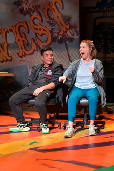In her world premiere three-hander, playwright Jordan Ramirez Pucket explores a new dimension on this theme with great sensitivity and a highly entertaining outcome. On the surface, Diane is a middle-aged, white-bread elementary school teacher from Ohio. One summer, she takes her soon-to-be 15-year-old son Mateo on a driving trip to San Diego. However, the notion of this being a slice of traditional American life ends there. The fact that the action is punctuated with hip-hop song and dance diversions by Mateo in English and Spanish in which he shares inner thoughts should provide a clue. Lee Ann Payne beautifully portrays Diana, the earnest and caring mother of an adopted boy. Her blend of tight and loose rules mixed with love have produced a warm relationship with Mateo. Diane lightheartedly refers to this trip as his quinceañero, which Mateo bristles at because quinceañeras, celebrating the 15th birthday, are for girls, and there is no male equivalent. A bright, ebullient, and sensitive Mateo is portrayed by a smiling and visually expressive Jon Viktor Corpuz as a teen who loves Diane but is intimidated by much of what surrounds him. Mateo was born in San Diego and identified as Latino of unspecified origin. The purpose of the trip is the hope to find his roots. Much of the play deals with the routines of travel, from license plate games to car breakdowns, and to the theme of parent-child relationship, which in this case is positive. Mateo even learns about car radio and dead zones in population wastelands. But by manipulating the static, he manages to make it the basis for the beat in hip hop he creates. Several important social issues are plumbed. One of Mateo's goals is to be able to confront the taunts that his birth mother was a "crack whore." Raised in an Anglo environment, he has been subjected to bigotry by bullies. Despite Mateo having no connection to Latin culture, the issue of a stereotypical identity being forced upon him is revealed. This widespread bias has been suffered not only by Latinos but by Jews, Blacks, and others. The anxiety from facing discrimination turns to fear when their car is stopped by Border Patrol in Texas, and mother and son are subjected to the humiliation and apprehension of trying to prove that Mateo is an American. Nothing could be more timely than this comment on the horrendous practices of ICE, which differ little from police state tactics. One of the conundrums involving anonymous adoption is implied and ultimately addressed directly. Many adoptees are unable to simply accept their identity as free-standing individuals. They seek the anchor of knowing what group or what blood family they are part of. When the child desperately seeks this link by finding the birth mother, the adoptive mother, who has devoted her life to the sacrifice of raising the child, may sense rejection and emptiness. A final dynamic is that Diane is a lesbian. It was her partner who yearned to have a child, but she died within two years of the adoption, so Diane has raised Mateo as a single parent. At one of the motel stops on the trip, a woman flirts with her and she has the opportunity to have physical contact with another person for the first time since her partner's death. But Diane still takes flowers to her lover's gravesite weekly and feels guilt about the thought of being with another. This clinging to the past and one more episode examine the subject of moving on and question whether it is time for Diane. Incidents occur along the way, and the several locals involved in those events–waitress, motel clerk, AAA attendant, nurse, and the cruel Border Patrol agent–are all played by Livia Gomes Demarchi. Changes in costume, hair, and her affect provide convincing differences among the several characters she depicts. The action plays on a full-thrust stage, which limits the set design, but Christopher Fitzer takes good advantage of the one wall and uses rolling props to provide a window into the various venues, where the viewer's imagination fills the stage. One of the Bay Area's primo directors, Jeffrey Lo, produces a well-paced, funny, and dramatic story with sympathetic characters. Though it is cram-packed with notable issues, A Driving Beat also stands as a fine and thoroughly enjoyable entertainment. TheatreWorks Silicon Valley's A Driving Beat runs through November 23, 2025, at Mountain View Center for the Performing Arts, 500 Castro Street, Mountain View CA. For tickets and information, please visit theatreworks.org. |