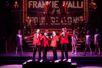Jersey Boys is told in four sections, appropriately matching the four seasons of the year. Each member of the quartet narrates one part of the time-sequenced story, putting his particular spin on a history that is full of false starts, sky-rocketing successes, personal tragedies, and personal loyalties thicker than blood as well as lies and betrayals that lead to personal and professional break-ups. The narrations are frequently punctuated by the sounds of songs as old friends once heard on 45s and still heard decades later on any streaming service. Tyler Savin begins the story with the "Spring" section as the cocky, heavy-Jersey-accented Tommy DeVito, self-proclaimed founder and leader of the group (and also occasional visitor to what he calls the "Broadway Correctional Facility," or prison). Taking us through his search for just the right foursome, as the earlier versions of trios and quartets play small clubs and street corners, Tommy also tells us how the initial group goes from being known as The Romans to The Village Voices to The Varietones to The Four Lovers–the latter quartet moving disastrously into comedy and emptying clubs with campy songs like "I Go Ape." While the ego-inflated, big-guy-acting Tommy DeVito was usually not a featured soloist of the group, Tyler Savin proves he has the vocal goods as he solos in "Earth Angel." The All-American, clean-cut Bob Gaudio (Andrew Cope), who at 15 had already had a #1 hit, "Short Shorts," picks up the story of "Summer" as he becomes the fourth piece of the pie. An excitable, high-voiced Jersey kid named Joey (a hilariously cute Skyler Riordan) introduces Bob to a hesitant Tommy; this kid grows up to be actor Joe Pesci and a life-long friend with his Jersey-hood friends. The addition of Bob Gaudio and his talent in songwriting leads to the first three big hits of a group still in search of the right name. The universally familiar numbers–"Sherry," "Big Girls Don't Cry," "Walk Like a Man"–are delivered in such glorious harmony and eye-popping style that it took me all I could not not to sing along. The hits also coincide with the foursome finally finding the right name, inspired by a neon "Four Seasons" sign on a bowling ally. The charismatic Andrew Cope as Bob shines with a voice contagiously engaging as he belts the ever-popular "December, 1963 (Oh, What a Night)." Standing like a tall, lanky giant, the usually soft-spoken bass singer of the group, Nick Massi (Justin Kerekes), is Tommy's longtime friend from the neighborhood and singing partner from the beginning. Nick takes over as the narrator for "Fall," a season that finds Tommy's mounting money problems landing the group for a weekend sitting on toilets in a Ohio jail and beginning to create fissures within the otherwise immensely successful and tight group. With "Winter" comes a side of the group's story told by the most famous and longest-sustaining star of The Four Seasons, Frankie Valli. In the iconic role that won John Lloyd Young a Best Actor in a Musical Tony, James M. Jones carries on the tradition superbly as the diminutive, angel-voiced Frankie, taking his several-octave range into falsetto heavens with total ease and confidence. He also solos on numbers that become further proof of the original Valli's unique talents that have struck chords deep within listeners around the globe for generations (e.g., "Can't Take My Eyes Off You" and "Fallen Angel"). Jones is not only totally convincing with his incredibly clear and consistently striking vocals, he is also compelling in conveying the hurt and tragedies that Valli experiences and causes others to experience, the blind devotion he has to those who once helped him, and the extreme drive to connect to his audiences. Supporting the headlining foursome is a cast providing a number of noteworthy performances and playing both a primary and several secondary roles. Samantha Kenbrandt is Frankie's first wife–Mary Delgado, fiery in red hair and in disposition–who joins him in a heart-touching and closely harmonized "My Eyes Adored You." Danny Martin frolics in and out of scenes with swish, spread-finger hands, and a lot of wild color in his frocks and his words as producer Bob Crewe, who brings the newly formed Four Seasons into their fame. John Mannion is perfect in the role of the serious but sentimental mob boss Gyp DeCarlo, who loyally sticks with the group through its roughest periods based on Frankie's beautifully intoned "My Mother's Eyes." Part of Gyp's help is keeping fellow gangster and loan shark Norm Waxman (a steely eyed Dave Lentz) from roughing up free-spending Tommy. Moving their white-gloved hands in exacting precision, Samantha Ayoob (featured soloist), Samantha Borthwick, and Lauren Jiang prove their own vocal metal as The Angels in a rousing, toe-tapping "My Boyfriend's Back." Kudos goes also to each member of the production team, first and foremost to Doug Santana for his precisely timed and imaginatively blocked direction for a show with over fifty scenes. Every corner, aisle, and peep-hole of the Lucie Stern Theatre becomes fair game for a bit of action. Patrick Klein impressively has designed the familiar two-level, erector-like set with multiple settings of cafes, nightclubs and apartments appearing and receding seamlessly. His backdrop of colorful projections add context and color to all scenes. Edward Hunter's lighting shines with the excitement of the concert stage and provides spot focus on the solos of Frankie and others. Never a lyric is missed nor is there any hint of imbalance between singers and the magnificent band of ten (Nick Kenbrandt, conductor), given the sound design of Jeff Grafton. And finally, a standing O to Jenny Garcia for the period-perfect array of eye-popping costumes that must have packed the backstage area to the gills and to Nicole Hoke for sending us all back several decades in our memories with her hair, wig, and makeup artistry. It is now five times and counting fo