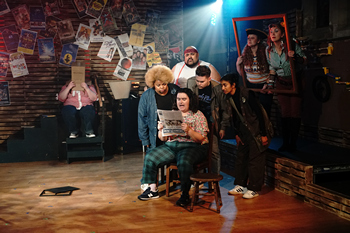 This world premiere runs about two hours and fifteen minutes with intermission, but there's not a dead spot to be found under the taut and lively direction of Rachel Tibbetts. A circle of young friends and their families face eviction from their homes for dubious reasons, unless they can track down a fortune in gems to buy back their neighborhood. These tweens are played by popular millennial St. Louis actors in a story based on a concept by the director and one of her actors, the terrific Cassidy Flynn. It's all intricately adapted and lampooned by another one of the fine comic performers, the playwright who's known in these parts simply as Keating. The characters are regularly scattered into a state of panic by an escaped criminal named Jake Fratelli (Anthony Kramer, in his funniest performance to date) and by his family, LaWanda Jackson as the nefarious Mama Fratelli and Victor Mendez as Francis Fratelli, fearlessly chewing the scenery in service of it all. There is one quiet "F" bomb in a climactic moment, but otherwise it's great innocent fun. The band of kids are smothered by touching in-group allegiances, as they search for a pirate's booty from the 17th century. And the show has a wonderful childish chemistry that binds us all together by the final curtain. Carl Overly, Jr. and Ricki Franklin are flawless as bickering young brothers, in a search that leads them all to an abandoned restaurant, with lots of references to other movies as well. The visually chaotic set design by Erik Kuhn is largely made up of wooden lath covered in movie posters. And there's a sort of wall of memories, where several of the actors get to hang tributes to their own favorite childhood films. The short monologs about how each of these films affected them growing up become especially lovely in the final half-hour. The stage's frenetic-looking backdrop matches the story 100%. Frankie Ferrari is great as Cyndi Lauper, and playwright Keating is a lithe cartoon character as Chunk. Hailey Medrano is excellent as the reluctant final addition to the group, Andy, an imperious cheerleader. And Ashwini Arora, Courtney Bailey, Katie Donnelly and Marcy Wiegert go all the way in comic enthusiasm in a show that unexpectedly makes a home for us too, in a funny, fast-paced tribute. Classic Adventure Movie; Or Never Say Die, produced by the Slightly Askew Theatre Ensemble, runs through September 27, 2025, at the Chapel on Alexander, 6238 Alexander Drive, St. Louis MO. For tickets and information, please visit www.satestl.org. Cast: Production Staff: |