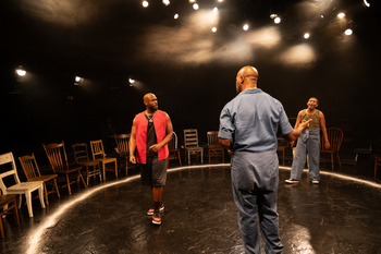 It's Pinter without the pauses, as family drama smashes through the guardrails in a very fluid, dancey show, with relentlessly great choreography by Kirven Douthit-Boyd of St. Louis Dance Theatre. In 2007, The Brothers Size premiered simultaneously at the Young Vic in London and at the Public Theater (in a co-production with the Foundry Theatre). McCraney won an Academy Award for another work, his screenplay for Moonlight, on a memorable night in 2017. In The Rep production, Christian Kitchens is terrifically exuberant as the reckless youngest brother, Oshoosi. Even before his older siblings clash, he's every spark that flies off their parentless family dynamic. Mr. Kitchens will drive you crazy, if you're older, with his heedless antics. But the scale and scope of all three characters on stage transmutes invisibly into something vastly greater. And that's when you start to feel a bitter sense of pity for him as a pawn for the gods. Halfway through, things change before you're even aware of it. And he's caught up in a struggle between two infinitely more powerful beings. Nic Few is funny and charming, but mostly glows like a burnished, double-stamped gold coin as the eldest brother Ogun, the de-facto parent of the family. He blazes with a particular kind of righteousness. In his perfectly disciplined life, as the owner of a small auto repair shop in the Louisiana Bayou, he's also devoted and occasionally deeply sympathetic, because Southern law is an enemy to them all. Still, chaos crawls in again and again, complicating family relationships. And all the family rules belong to him, which means that middle-brother Elegba (the magical Donald Jones Jr.) must create his own existence outside of a powerful altruism. It reminds me of a couple of plays I saw last season in Chicago, though The Brothers Size can claim all rights of originality in this very short list. In a world premiere last year, in Leroy and Lucy at Steppenwolf, the characters also changed into eternals, though much more overtly. And in At The Wake of a Dead Drag Queen at The Story Theatre (presented at the Raven Theatre), we were told an African folktale of a woman desperately in love, who takes some very bad advice. It's the same folktale referenced here in The Brothers Size. But this play predates At The Wake... by about twelve years, and Leroy and Lucy by seventeen. No disrespect to those other plays, of course. "Randomness is clumpy" as they say (about coincidence) on the science podcast "The Skeptics Guide to the Universe." In this production, the talents of the playwright, director, and choreographer merge together to create a flickering duality that's strange and unexpected. We stare in disbelief as a new reality thrums before us. Thematically, The Brothers Size takes us all the way back to the beginnings of theatre, as gods emerge and intervene on the most personal level in our lives. But if that sounds too ethereal, the show also bangs and clangs with genuine passion and humor. And in a very modern context, in the Studio Theatre at the Rep, we descend into the sub-basement of the mind: where motive and reason also wear fearsome masks. The Brothers Size runs through November 16, 2025, at The Repertory Theatre of St. Louis, 130 Edgar Rd., St. Louis MO. For tickets and information, please visit www.repstl.org. Cast: Production Staff: Additional Production Credits: * Denotes Member, ActorsÂ’ Equity Association |
