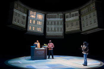 Then again, some of the people leaving the theater seemed to have a vaguely "exposed" look on their faces on opening night, I thought. But it's really a charming experience, like Harvey by Mary Chase, with its giant invisible rabbit following Elwood P. Dowd around in 1944 to their bar of choice. Now flash-forward eighty years to when Eboni Booth won the Pulitzer Prize for Primary Trust, after its debut Off-Broadway the year before at the Roundabout Theatre Company. Primary Trust is directed here with great warmth and insight by Tyrone Phillips. And the show rests comfortably on the shoulders of Gregory Fenner as Kenneth: a 38 year-old man who's spent a lot of time locked up in his own childhood. Somehow he seems okay at happy hour. But drunk or sober, "that guy is really likable," I said to myself the moment Mr. Fenner walked on stage. And like Elwood Dowd, Kenneth probably could have been "oh so smart," but chose to be "oh so pleasant" instead. Except for his occasional panic attacks, which are hard to watch. And his livelihood is hanging by a thread, working in a smoky old bookstore. Mr. Fenner is gentle, but highly detailed in performance. And when Kenneth finally summons up the courage to go out on a date, every one of his little tics and nervous false starts becomes part of an unseen beaux arts entryway the actor builds up around him, to usher in some gentle truth for his sweetheart. With seemingly little hope of success. Composer Jermaine Manor plays soft, reassuring circus-type music upstage in the shadows, under a great surreal set designed by Sotirios Livaditis. An upside-down cityscape floats above a luminous modern "city map" painted on the stage floor, like the kind of map you'd see on a cell phone. Primary Trust is set in a small town in the Northeast, easy enough for Kenneth to get around in. But how can he ever get a new job up in any of those elegant old buildings, when they're all floating in mid-air and upside down? His story is set up like a high-wire act, down here on earth. Kierra Bunch is wonderful in a variety of roles, especially as a waitress in a retro tiki bar where about a third of the story is set. And Ronald L. Conner is excellent as Bert. Alan Knoll plays three funny roles on stage with magnificent aplomb. Overall, it's an unexpectedly healing experience. Even so, some in the audience did appear to me to be strangely vulnerable afterward–not in the Joan Didion sense, from The Year of Magical Thinking, loss snowballing into broader loss–but "vulnerable," like a Helen Keller: convinced that loss could be reclaimed, if only we had a greater sense of it. Primary Trust, runs through March 1, 2026, at The Repertory Theatre of St. Louis, 130 Edgar Rd., St. Louis MO. For tickets and information, please visit www.repstl.org. Cast: Production Staff: Additional Production Staff: Director of Production: Jayson Lawshee-Gress * Denotes Member, Actor's Equity Association ** Denotes Member of the American Federation of Musicians *** Denotes Member, USA-829 |